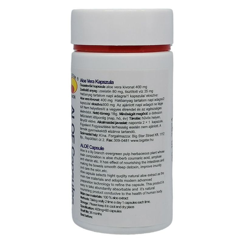 Az aloe levelének belsejéből nyert gumitej porításával készült kapszula erős hashajtó hatású. Székrekedés, valamint fogyókúra esetén javasolt alkalmazni, természetes hashajtóként. Az aloe vera természetes gyulladáscsökkentő, továbbá kimutatták a gyógynövény vírusölő hatását is, amely segítség a Herpes simplex esetében. Az Aloe Vera Kapszula pótolja azokat a tápanyagokat melyek, élelmiszereinkből hiányoznak. Vitaminokat, aminosavakat, ásványi anyagokat, nyomelemeket és enzimeket tartalmaz. Sejtregeneráló hatása folytán külsőleg szépít, fiatalít, belsőleg tisztít, megújít. Immunerősítő hatása segít a legyengült szervezet felerősítésében.