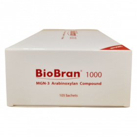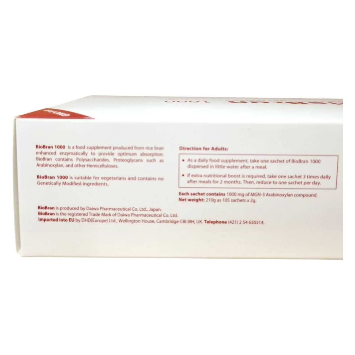 A BioBran 1000 egy Japánban gyártott étrend-kiegészítő, amely rizskorpából készül, és enzimatikusan fejlesztették ki az optimális felszívódás érdekében. A termék poliszacharidokat, proteoglikánokat, például arabinoxilánt és más hemicellulózokat tartalmazhat. A BioBran 1000 vegetáriánusok számára is alkalmas, és nem tartalmaz genetikailag módosított összetevőket. A terméket az EU-ba a DHD(Europe) Ltd. importálja. A termék 105 tasakot tartalmaz, mindegyik tasak 1000 mg MGN-3 Arabinoxylan vegyületet tartalmaz. A termék használata során fontos, hogy ne lépje túl az ajánlott adagot, és ne használja a változatos étrend helyettesítésére.