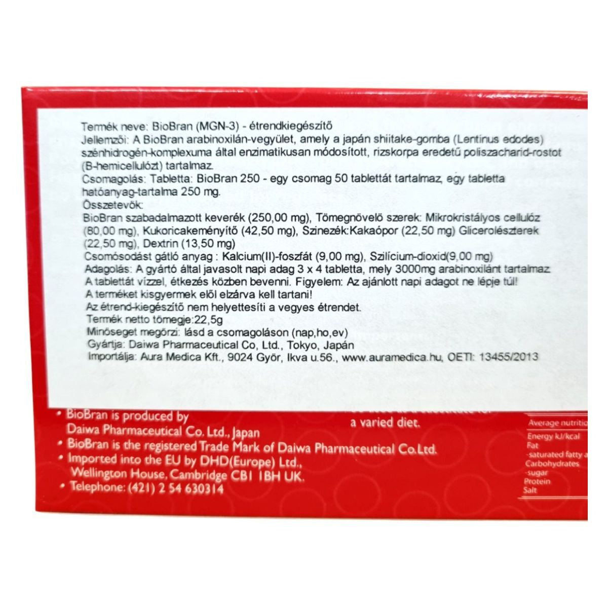 A BioBran (MGN-3) étrendkiegészítő egy különleges arabinoxilán-vegyület, amely a japán shiitake-gomba szénhidrát-komplexuma által enzimatikusan módosított rizskorpa eredetű poliszacharid-rostot tartalmazhat. A termék GMO-mentes, és napi adagja 3000 mg arabinoxilánt biztosíthat. A tablettákat vízzel, étkezés közben ajánlott bevenni. A termék energia- és tápértékei 100 g-ra vonatkoztatva: 1316 kJ/314 kcal energia, 5.6 g zsír, amelyből 1.6 g telített zsírsav, 16.9 g szénhidrát, amelyből 16.0 g cukor, 6.4 g fehérje és 0.1 g só. A terméket a Daiwa Pharmaceutical Co. Ltd. gyártja, és az Aura Medica Kft. importálja Magyarországra. Fontos figyelmeztetés, hogy az étrend-kiegészítő nem helyettesíti a vegyes étrendet, és kisgyermekek elől elzárva tartandó.