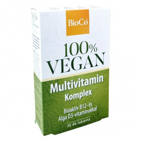 A BioCo 100% VEGAN Multivitamin Komplex készítmény a vegán életmódot követők számára készült. A termék a létező 13 vitaminból 11-et tartalmaz, kiemelten magas dózisban bioaktív, természetes metilkobalamin formájú B12-vitaminnal, valamint algából nyert D3-vitaminnal. A készítmény tökéletes kiegészítője a BioCo 100% VEGAN Alga Kalcium & Tengeri Magnézium terméknek. Magyar fejlesztésű és gyártású termék, ISO 22000 és Jó Gyártási Gyakorlat (GMP) szerint tanúsított élelmiszerbiztonsági rendszerben készül.