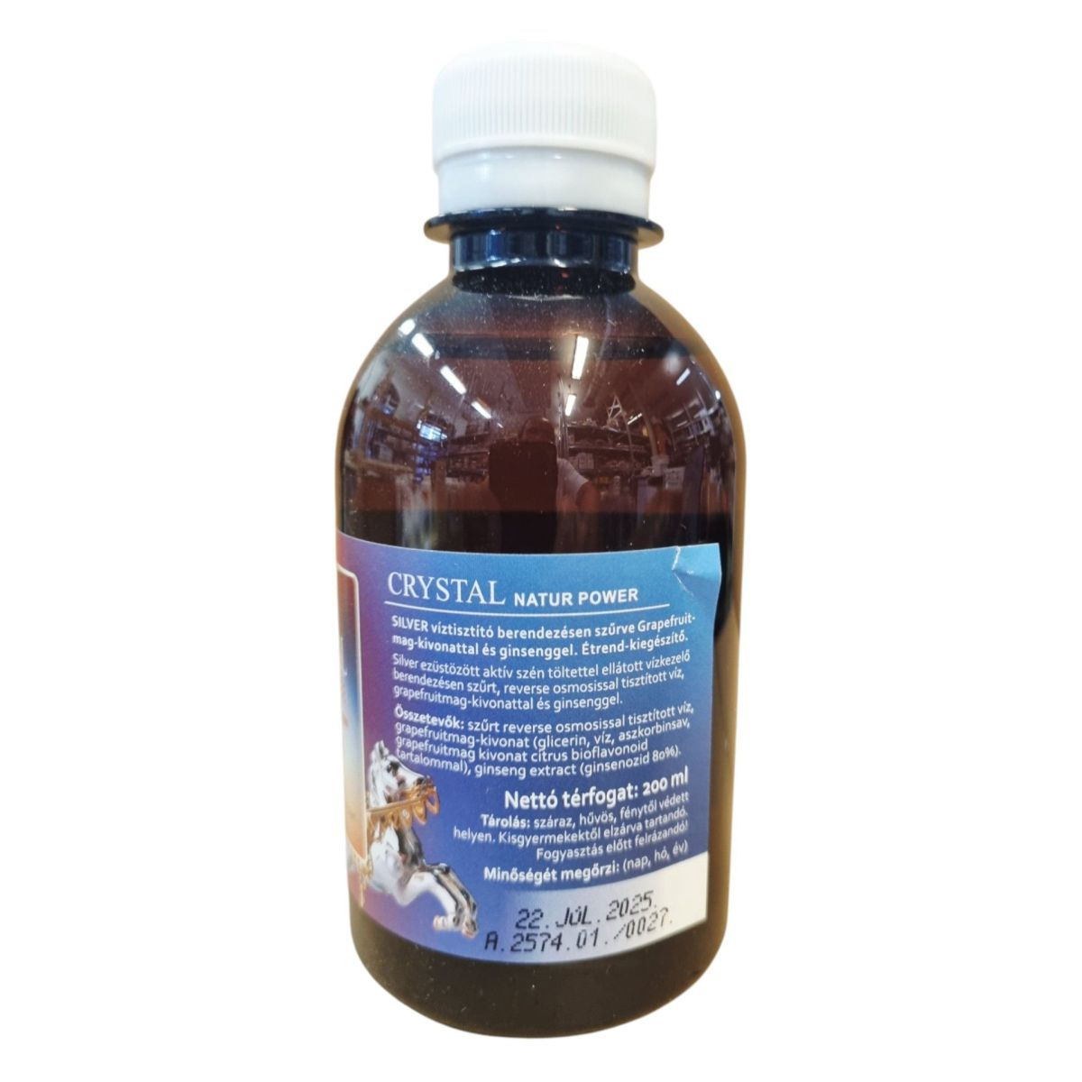 A CRYSTAL NATUR POWER GINSENG SILVER egy speciális étrend-kiegészítő, amely grapefruitmag- és ginzeng-kivonatot tartalmaz. A termék víztisztító berendezésen szűrt, reverse ozmossal tisztított víz alapú, amely ezüstözött aktív szén töltettel van ellátva. A grapefruitmag-kivonat citrus bioflavonoidokat tartalmazhat, amelyek antioxidáns hatásúak lehetnek, míg a ginzeng-kivonat ginsenoside-okat tartalmazhat, amelyek hozzájárulhatnak az energiaszint fenntartásához. A termék 200 ml-es kiszerelésben kapható, és javasolt napi fogyasztása 20-50 ml. Fontos, hogy az ajánlott napi mennyiséget ne lépje túl, és a termék nem helyettesíti a kiegyensúlyozott étrendet és az egészséges életmódot.