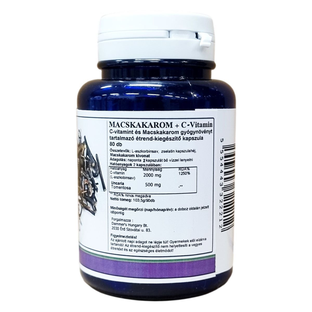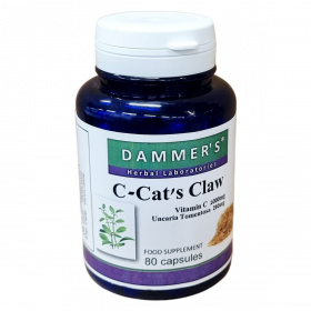 A Dammer's Herbal Laboratories terméke, a C-Cat's Claw, egy vitamin C-t és Macskakarom (Uncaria Tomentosa) kivonatot tartalmazó étrend-kiegészítő kapszula. A termék 80 darab kapszulás kiszerelésben érhető el, egy adag 2 kapszulát jelent, melyek 2000 mg C-vitamin és 500 mg Macskakarom kivonat hatóanyagot tartalmaznak. A kapszulák zselatin héjjal rendelkeznek, így könnyen lenyelhetők. A készítmény megfelel az étrend-kiegészítők szabályozásának, és bármilyen egészséges életmód részeként alkalmazható, de nem helyettesíti a vegyes táplálkozást. A termék az ajánlott mennyiség betartása mellett használható, gyerekek elől elzárva kell tartani.