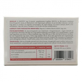 Összetevők (2 tabletta): zöld tea kivonat: 666,7 mg -ebből epigallokatekin-gallát (EGCG) 45%: 300 mg, B6-vitamin: 10 mg, D-vitamin: 50 µg.