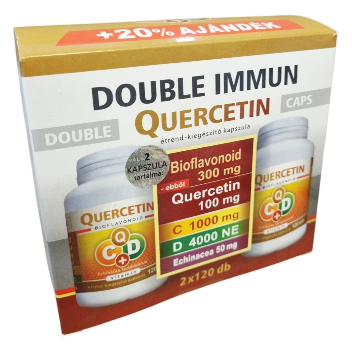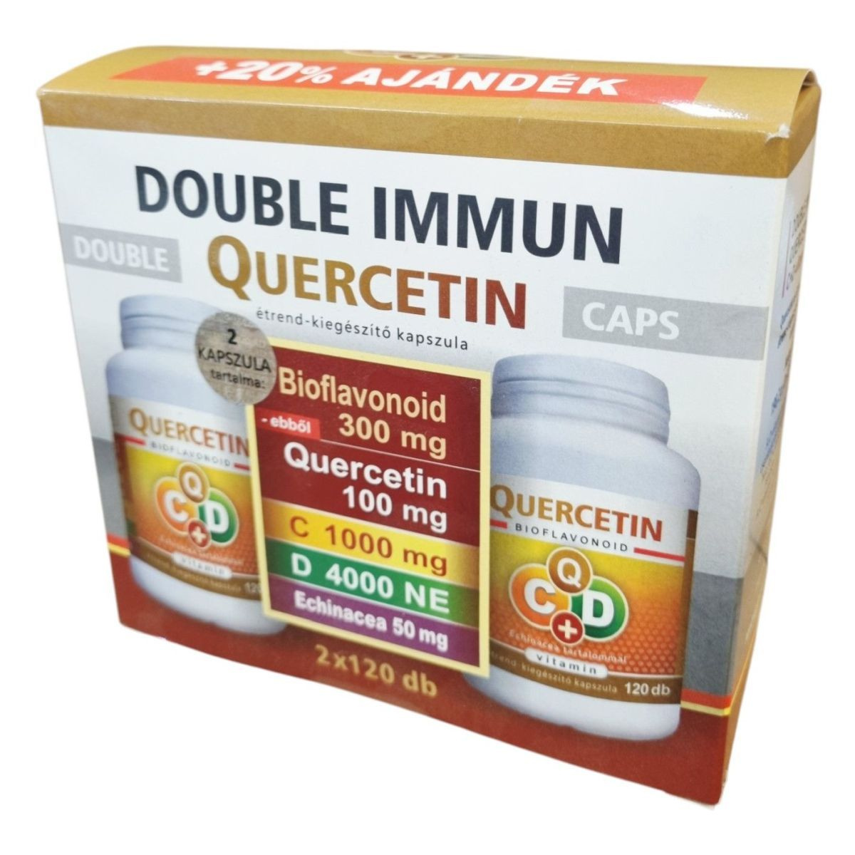 A DOUBLE IMMUN QUERCETIN kapszula quercetint és echinaceát tartalmaz, amelyek polifenol tartalmuk révén hozzájárulhatnak az immunrendszer támogatásához. A D- és C-vitamin segíthet az immunrendszer normál működésének fenntartásában.