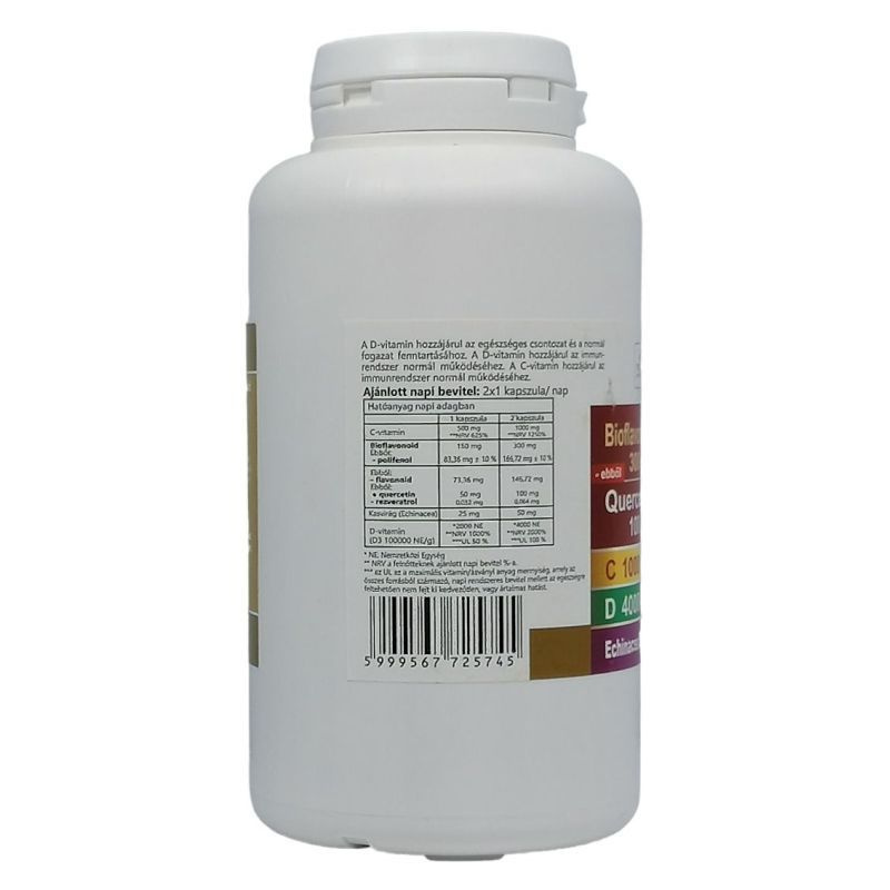 Hatóanyag napi adagban (2 kapszula): Bioflavonoid: 300 mg -ebből quercetin: 100 mg, C-vitamin: 1000 mg, D-vitamin: 4000NE, echinacea: 50 mg.Felhasználási javaslat: 2 kapszula / nap.