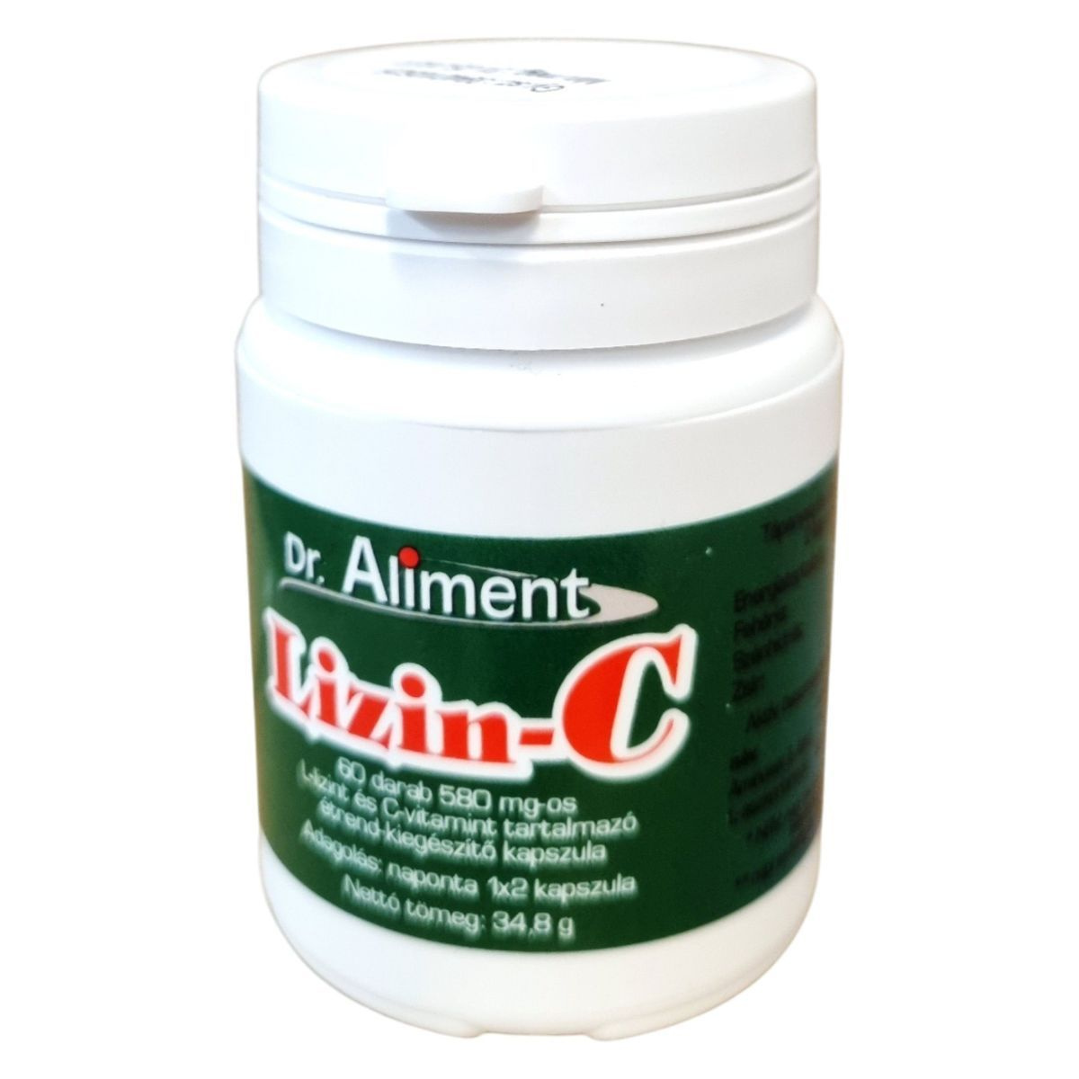 A Dr. Aliment Lizin-C kapszula egy 60 darabos, 580 mg-os kiszerelésű étrend-kiegészítő, amely kombinálja az esszenciális aminosavat (L-lizin) és a C-vitamint. A termék célja, hogy támogassa a szervezet immunrendszerét, valamint hozzájáruljon a bőr és kötőszövetek normál állapotának fenntartásához. A kapszulák nem tartalmaznak hozzáadott cukrot vagy mesterséges színezéket, és napi kétszeri fogyasztás mellett biztosítják a megadott hatóanyagbevitelt. Nettó tömeg: 34,8 g.