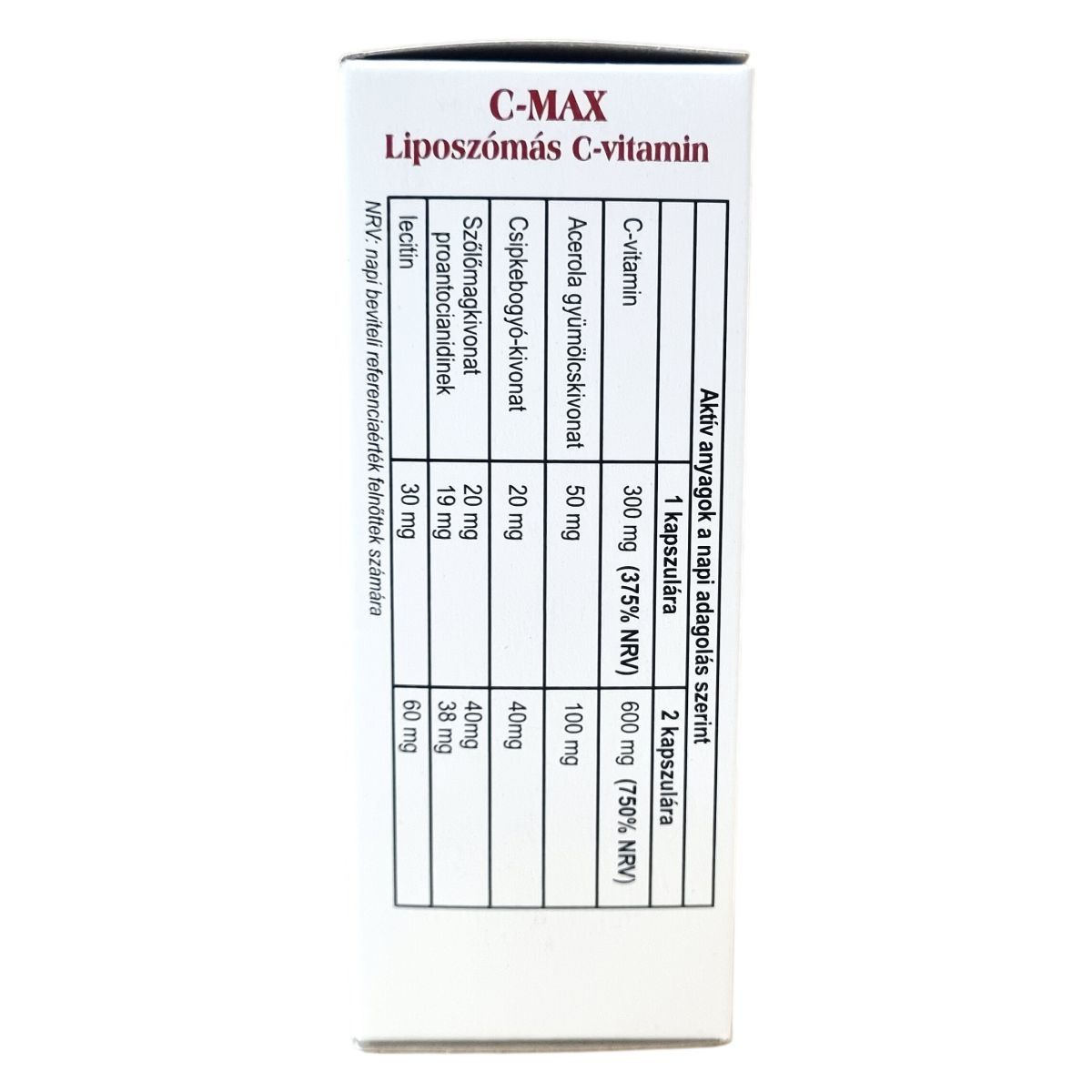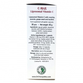 A C MAX Liposzómás C-vitamin különleges technológiával készül, amelynek eredményeként a C-vitamint természetes, sejtmembránnal azonos foszfolipid réteg veszi körül, így ellenállóvá válik az emésztőnedvekkel szemben. A készítmény természetes csipkebogyó-, acerola- és szőlőmagkivonatot, valamint lecitint tartalmaz. A csipkebogyó és az acerola természetes C-vitamin források, amelyek hozzájárulhatnak a szervezet antioxidáns védelméhez és az immunrendszer támogatásához. A szőlőmagkivonat antioxidáns hatású komponenseivel a sejtek védelmét segítheti a szabad gyökök károsító hatásaival szemben. A C-vitamin szerepet játszhat az immunrendszer és az idegrendszer egészségének védelmében, valamint hozzájárulhat a fáradtság csökkentéséhez és a vas felszívódásának fokozásához. A kollagén képződés támogatása által hozzájárulhat a csontok, a fogak, az erek, a bőr és a fogíny normál állapotának fenntartásához. A készítmény szedése javasolt fokozott fizikai és szellemi igénybevétel, valamint feszült életmód esetén.