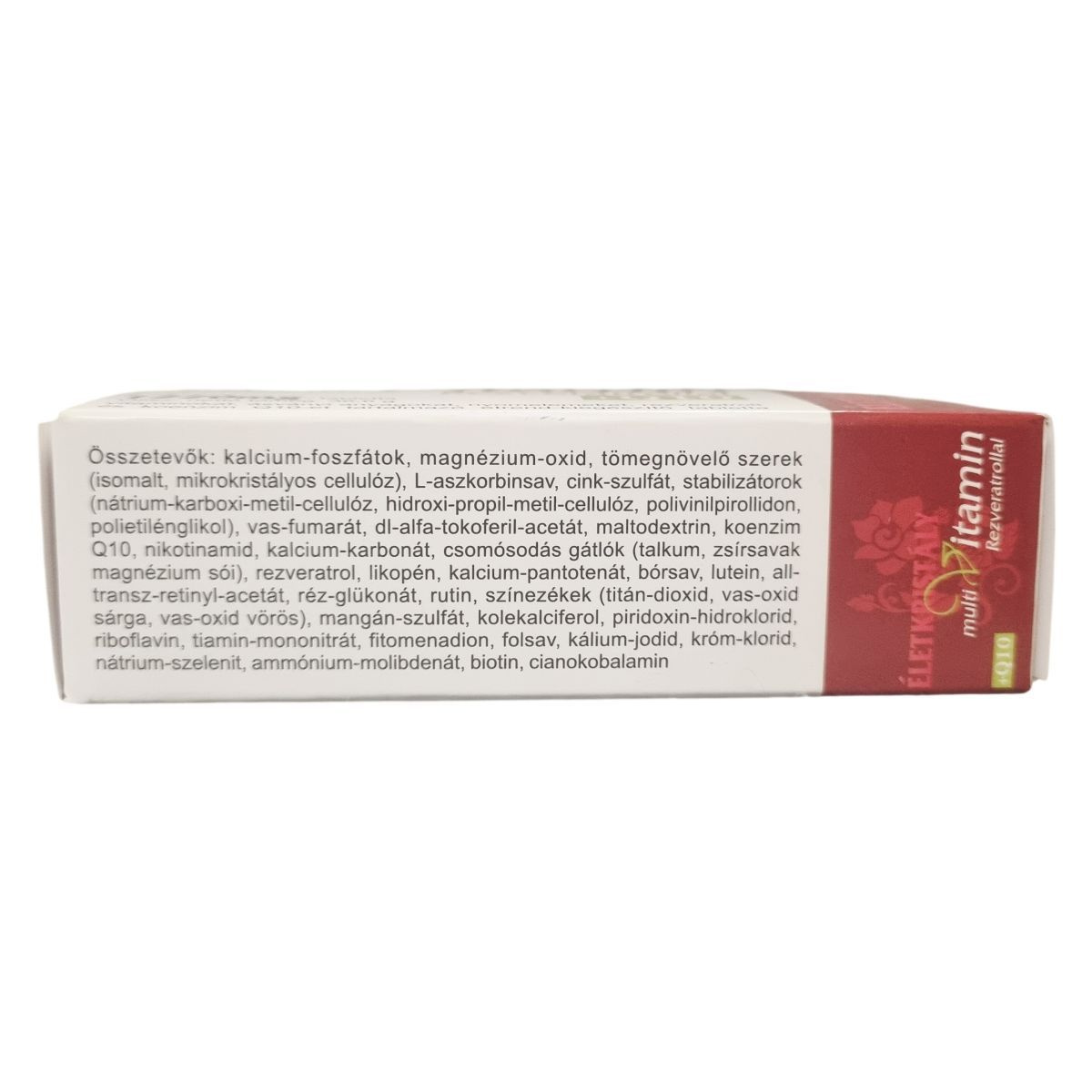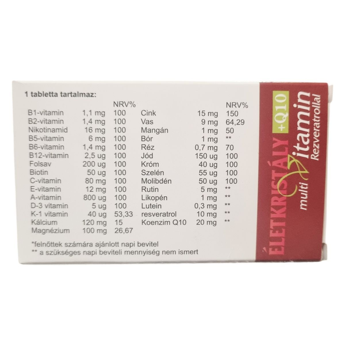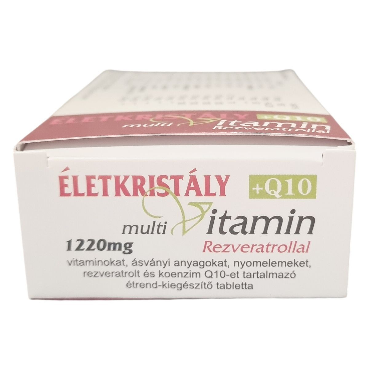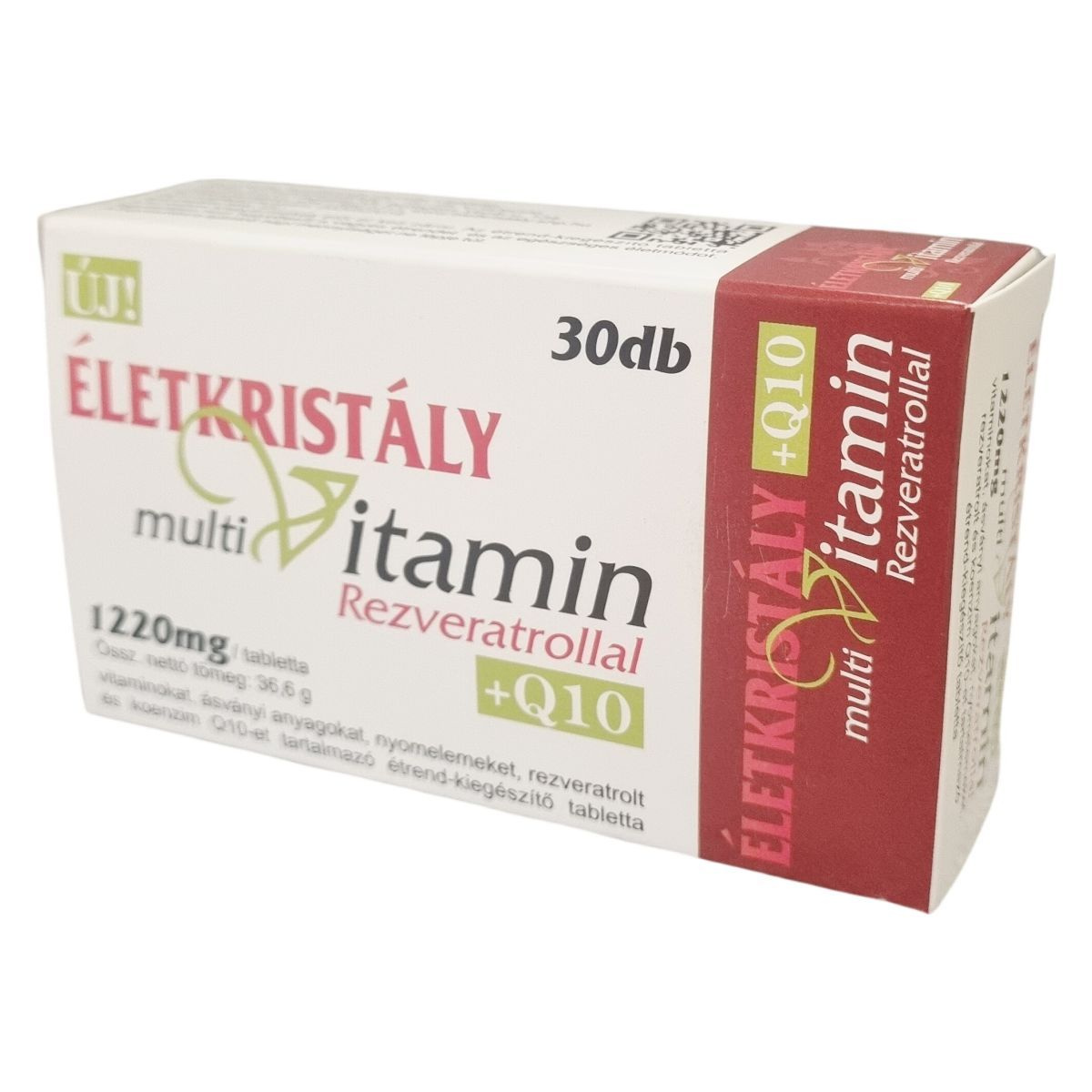 Az ÉLETKRISTÁLY multi vitamin Rezveratrollal +Q10 egy komplex étrend-kiegészítő tabletta, amely vitaminokat, ásványi anyagokat, nyomelemeket, valamint rezveratrolt és koenzim Q10-et tartalmaz. Egy tabletta nettó tömege 1220 mg, és a csomag 30 darabot tartalmaz. A termék származási helye az Európai Unió. Az ajánlott felhasználás szerint felnőtteknek naponta egy tablettát kell fogyasztani. A termék a tárolási ajánlásokat figyelembe véve szobahőmérsékleten, 15-25 °C között tartható. Az összetételében megtalálhatóak többek között B-vitaminok, C-, E-, A-, D3- és K1-vitaminok, valamint fontos ásványi anyagok, mint a kalcium, magnézium, cink, vas, mangán, bór, réz, jód, króm, szelén és molibdén. Különleges összetevők között szerepel a rezveratrol, likopén, lutein és koenzim Q10. A termék nem helyettesíti a kiegyensúlyozott étrendet és az egészséges életmódot, valamint kisgyermekek elől elzárva kell tartani. Forgalmazója az LC Hungary Kft., amely biztosítja a termék elérhetőségét Magyarországon.
