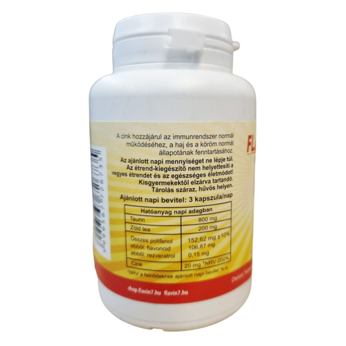 Taurin, Flavin 7 bioflavonoid komplex (vörös szőlő mag-héj szárítmány, cirok mag-héj szárítmány, feketeszeder mag-héj szárítmány, fekete cseresznye héj szárítmány, feketeribizli mag-héj szárítmány, pirosribizli mag-héj szárítmány, szilva héj szárítmány, almahéj szárítmány), HPMC kapszula (hidroxipropilmetilcellulóz), cink-oxid, sűrítőanyag, emulgeálószer, zöld tea őrlemény, cink-acetát (cink 30%).