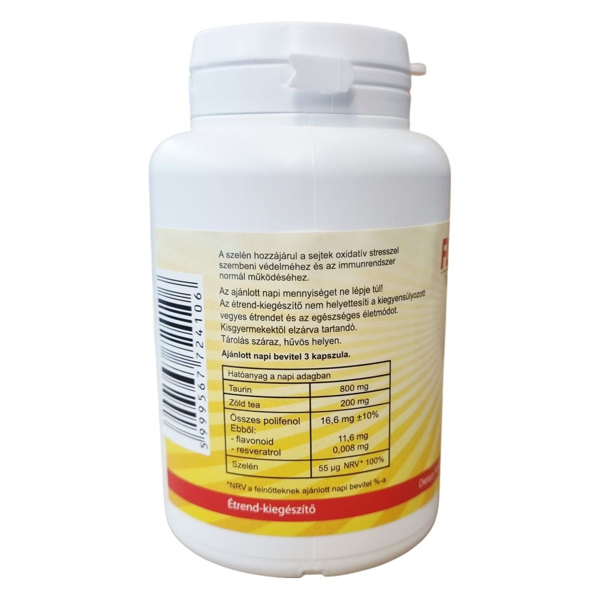 taurin, flavin 7 bioflavonoid komplex (vörös szőlő mag-héj szárítmány, cirok mag-héj szárítmány, feketeszeder mag-héj szárítmány, feketekcseresznye héj szárítmány, feketeribizli mag-héj szárítmány, pirosribizli mag-héj szárítmány, szilva héj szárítmány, almahéj szárítmány), HPMC kapszula (hipromellóz, cink-oxid, sűrítőanyag, emulgeálószer), zöld tea, nátrium-szelenit