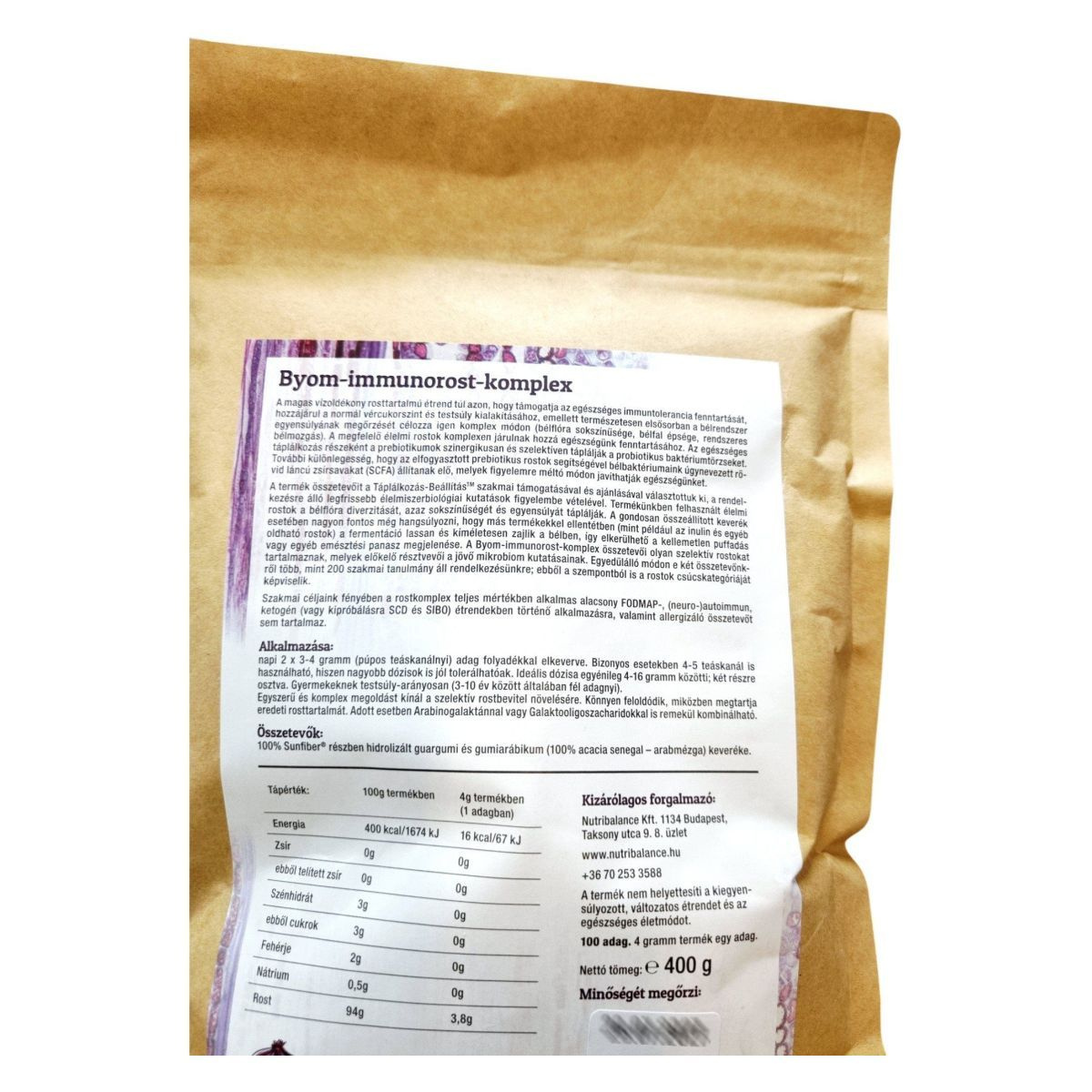 A Byom-immunorost-komplex magas vízoldékony rosttartalmú, amely támogathatja az immunotolerancia fenntartását, hozzájárulhat a normál vércukorszint és testsúly alakulásához, valamint a bélrendszer egyensúlyának megőrzéséhez.