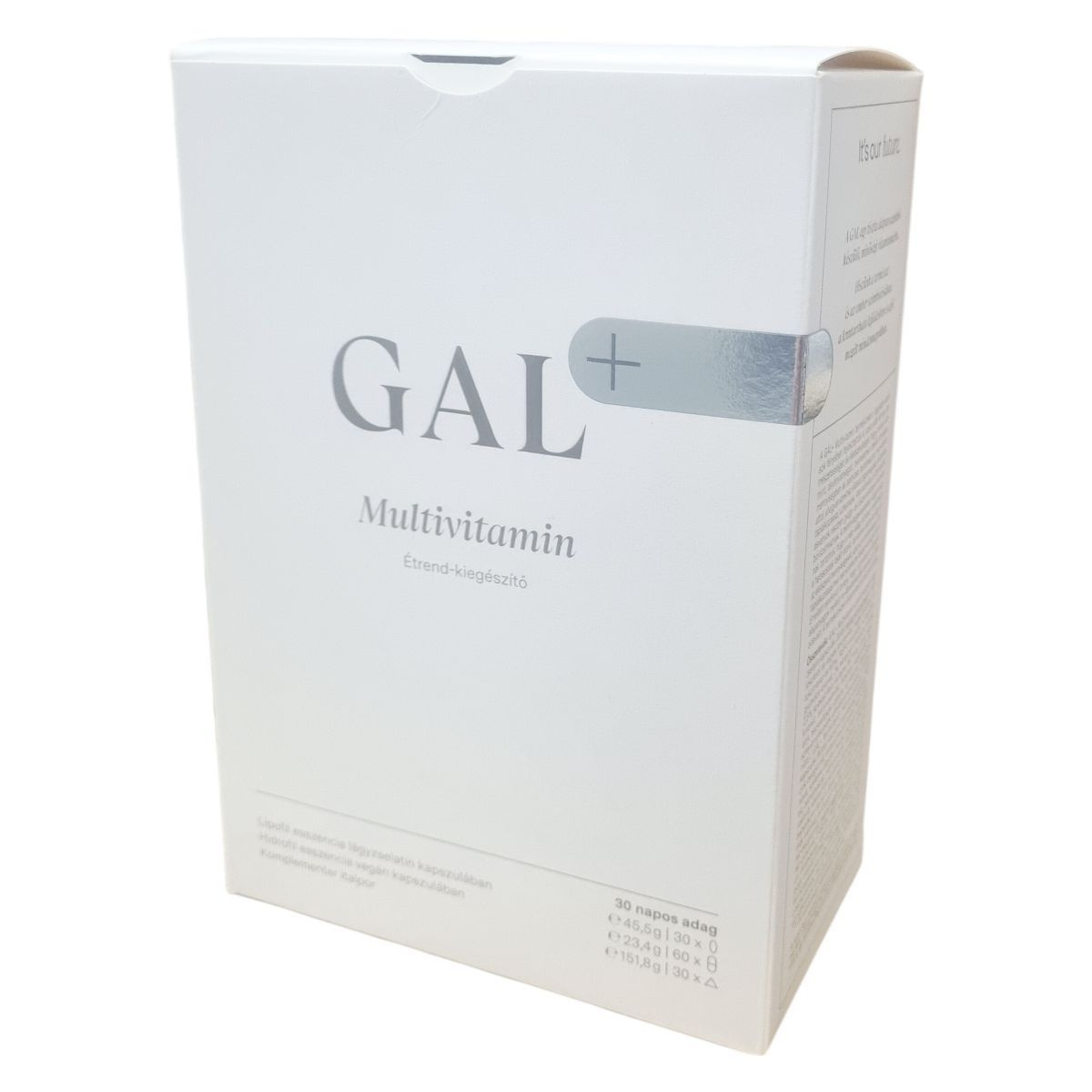 It’s our future. A GAL egy tiszta alapanyagokból készülő, minőségi vitaminmárka. Hiszünk a természet és az ember szimbiózisában, a fenntartható fejlődésben és a jól megélt mindennapokban. A GAL+ Multivitamin terméket úgy fejlesztették ki, hogy a vitaminok, ásványi anyagok és nyomelemek ideális formában, mennyiségben és arányban legyenek jelen, nem túllépve az életszerű mennyiségeket. A vízoldékony és zsíroldékony összetevőket elkülönítve alkalmazzák a stabilitás és a hasznosulás érdekében. A vízoldékony összetevők egy része vegán kapszulában, más része komplementer italpor formájában található meg, míg a zsíroldékony összetevők lágyzselatin kapszulában, Golden Omega® halolaj-koncentrátumban oldva, természetes tokoferolokkal, tokotrienolokkal és görög zsálya-kivonattal stabilizálva. A termék nagy mennyiségben tartalmaz magnéziumot, taurint, bambuszból nyert szilíciumot, K1- és K2-vitamint, valamint természetes (TG) formájú, hosszú láncú omega-3 zsírsavakat (EPA, DPA, DHA). A B9-vitamint aktív metilfolát formájában, Magnafolate® C-kristályos kalciumsóként tartalmazza. A termék nem tartalmaz B3-vitamint. A kolint külön termékként kínálják, mivel a kolinszükséglet egyénenként eltérő.