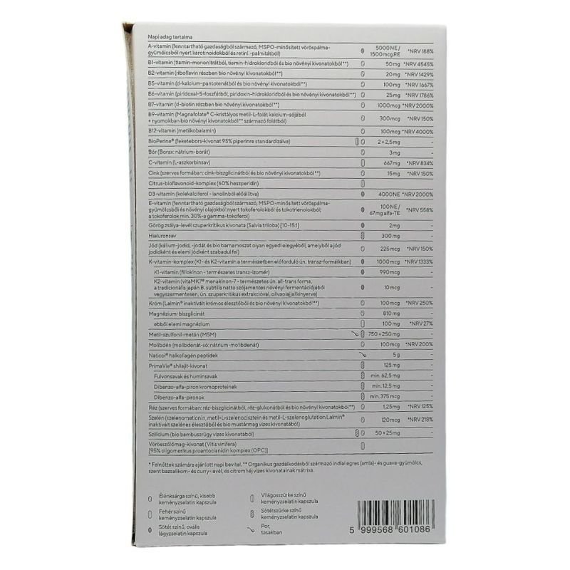 Vitaminokból a napi adagot egy-egy kis tasakban 5 porkapszula mellett 1 olajkapszulát talál, valamint 1 tasakban találja a halkollagén peptidet.
