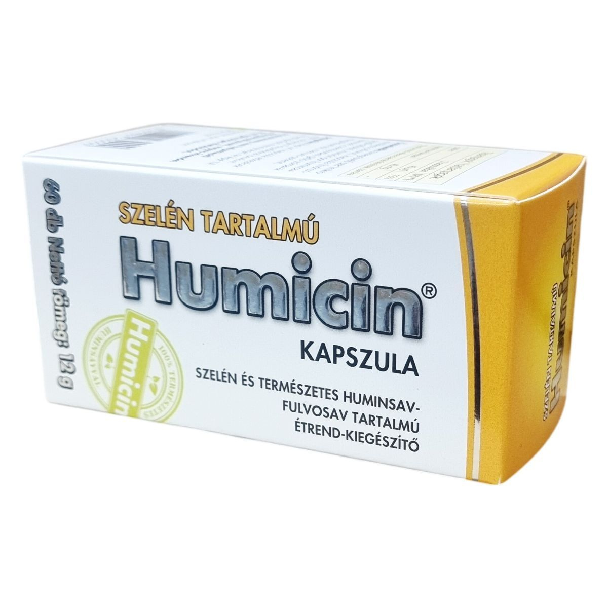 A Humicin® Szelén tartalmú kapszula egy természetes összetevőkből álló étrend-kiegészítő, amely szelént és huminsav-fulvosavat tartalmaz. A szelén hozzájárulhat az immunrendszer normál működéséhez, a sejtek oxidatív stresszel szembeni védelméhez, valamint a pajzsmirigy normál működéséhez, továbbá részt vehet a normál spermaképződés folyamatában. A terméket különösen kiegyensúlyozatlan táplálkozás vagy szigorú diéta esetén javasolt használni. A kapszula 60 darabos kiszerelésben érhető el és napi két alkalommal ajánlott szedni étkezések előtt, bőséges folyadékkal. A termék nem helyettesíti a változatos étrendet és az egészséges életmódot. Tárolását száraz, hűvös és fényvédett helyen kell biztosítani, valamint kerülni kell, hogy gyermekek hozzáférhessenek. A kapszula összetevői között szerepel mikrokristályos cellulóz, hidroxipropil-cellulóz alapú kapszula, Humicin por (huminsav-fulvosav), csomósodást gátló zsírsavak magnéziumsói és nátrium-szelenit.