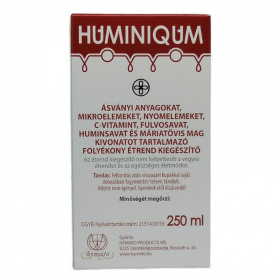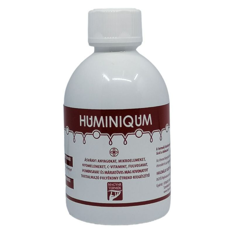 A Huminiqum étrend-kiegészítő szirup a szervezet számára szükséges mikroelemeket, huminsav és fulvosav komplexek formájában tartalmazza természetes arányban. A készítmény hatóanyagát világviszonylatban is egyedülálló, Magyarországi természetes humusz ásványból (leonardite) vonjuk ki. A Huminiqum étrend-kiegészítő szirup főbb jellemzői. Antioxidáns. Enzimaktivitás növelése. Antivirális. Szerves kelátképző. Az ásványi anyagok felvételét optimalizálja. Megköti a toxinokat. A sav-bázis egyensúlyt helyreállítja. Adagolás: Általános roborálásra 1x2-3 ml. Mikroelem hiányos tünetek kezelésére 1x4 ml. Fáradtság, levertség érzet esetén 1x5 ml. Fizikai megterhelés, versenyzés 2x3 ml. Szellemi kimerültség esetén 2x4 ml. Vérszegénységi tünetek, menstruáció 2x3 ml. Áldott állapotban, szoptatós anyáknak 1x2-4 ml. Betegség utáni lábadozás 2x3 ml. Gyermekeknek a napi adag fele javasolt. Reggel étkezés előtt, illetve este étkezés után 15-20 perccel ajánlott bevenni, egy pohár folyadékban (víz, tej, joghurt, gyümölcslé) elkeverve. Ízét kellemesebbé tehetjük és hatását fokozhatjuk, ha 1-2 csepp citromlevet adunk hozzá. A készítmény nem tartalmaz semmilyen adalékanyagot. Összetétel: Huminsav, Fulvosav, Vas-szulfát, Cink-szulfát, Mangán-szulfát, Réz-szulfát, Ammonium-molibdenát, Nátrium-hidrogén-foszfát, Nátrium-jodid, Króm-klorid, Nátrium-szelenit, Kobalt-klorid, desztilált víz.