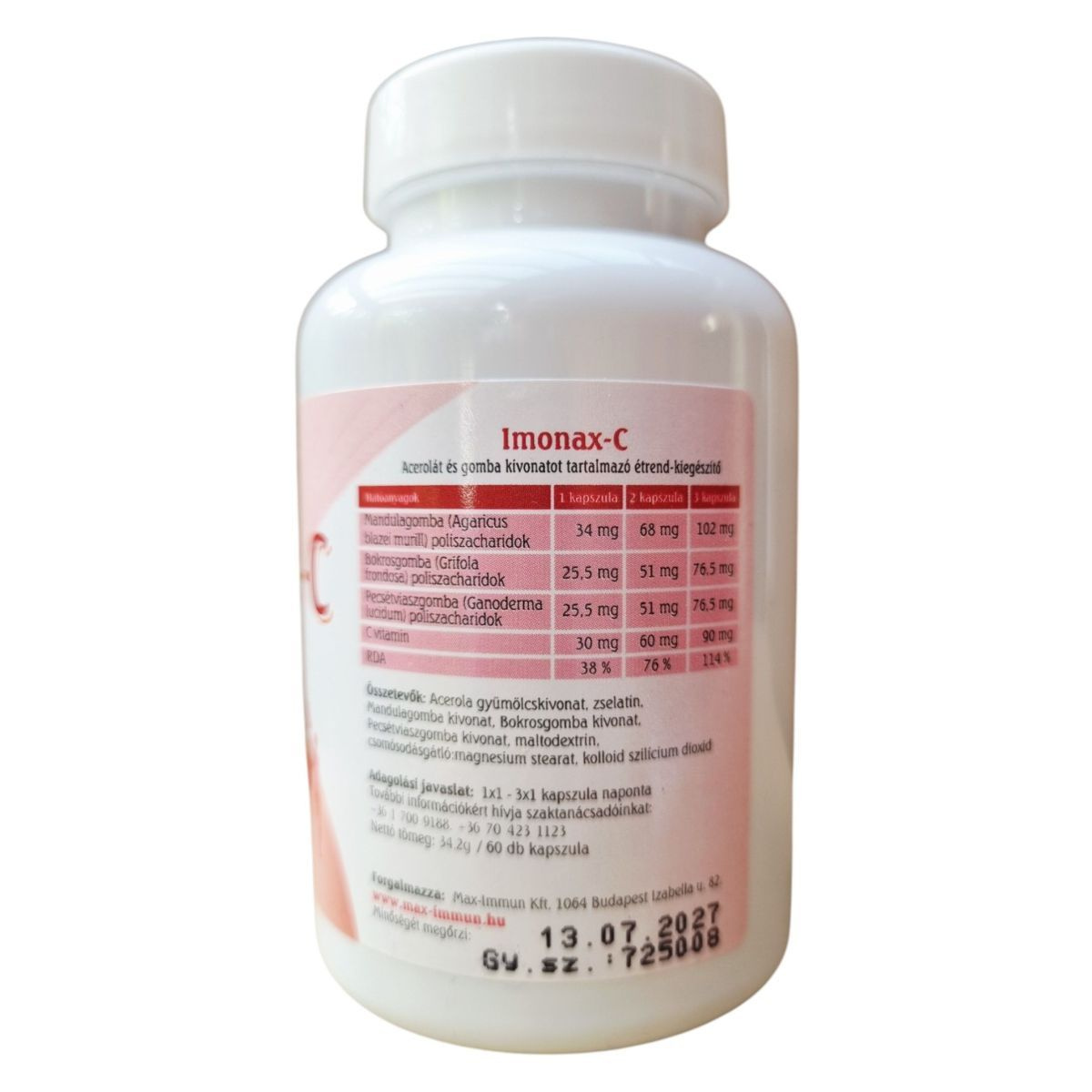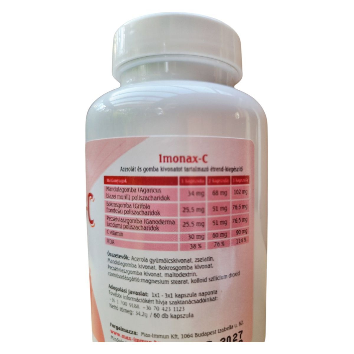 Az Imonax-C étrend-kiegészítő egy olyan termék, amely acerola gyümölcskivonatot és különböző gombakivonatokat tartalmaz, mint a mandulagomba, bokrosgomba és pecsétviaszgomba. Ezek a hatóanyagok poliszacharidokat tartalmaznak, amelyek hozzájárulhatnak az immunrendszer támogatásához. A termék C-vitamint is tartalmaz, amely antioxidáns hatású lehet. Az Imonax-C kapszulák napi 1-3 alkalommal történő fogyasztása javasolt. A terméket a Max-Immun Kft. forgalmazza, és fontos, hogy az ajánlott napi mennyiséget ne lépje túl. További információkért szaktanácsadó is elérhető telefonon.
