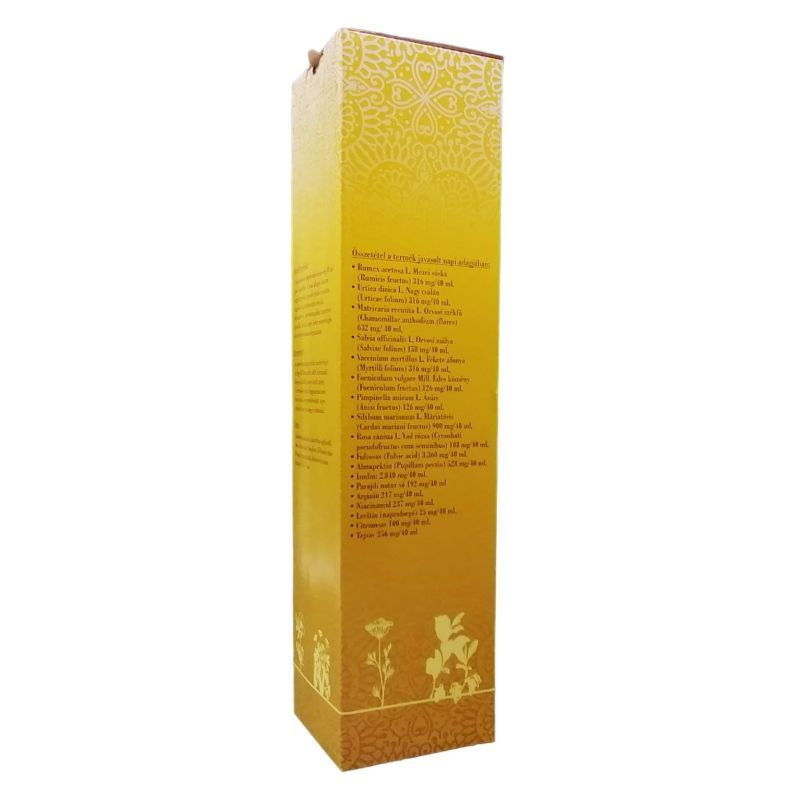 Összetevői: Mezei Sóska, Nagy csalán, Orvosi székfű, Orvosi Zsálya, Fekete áfonya, Édes kömény, Ánizs, Máriatövis, Vad rózsa, Fulvosav, Almapektin, Parajdi natúr só, Arginin, Niacinamid, Lecitin (napraforgó), Citromsav, Tejsav.