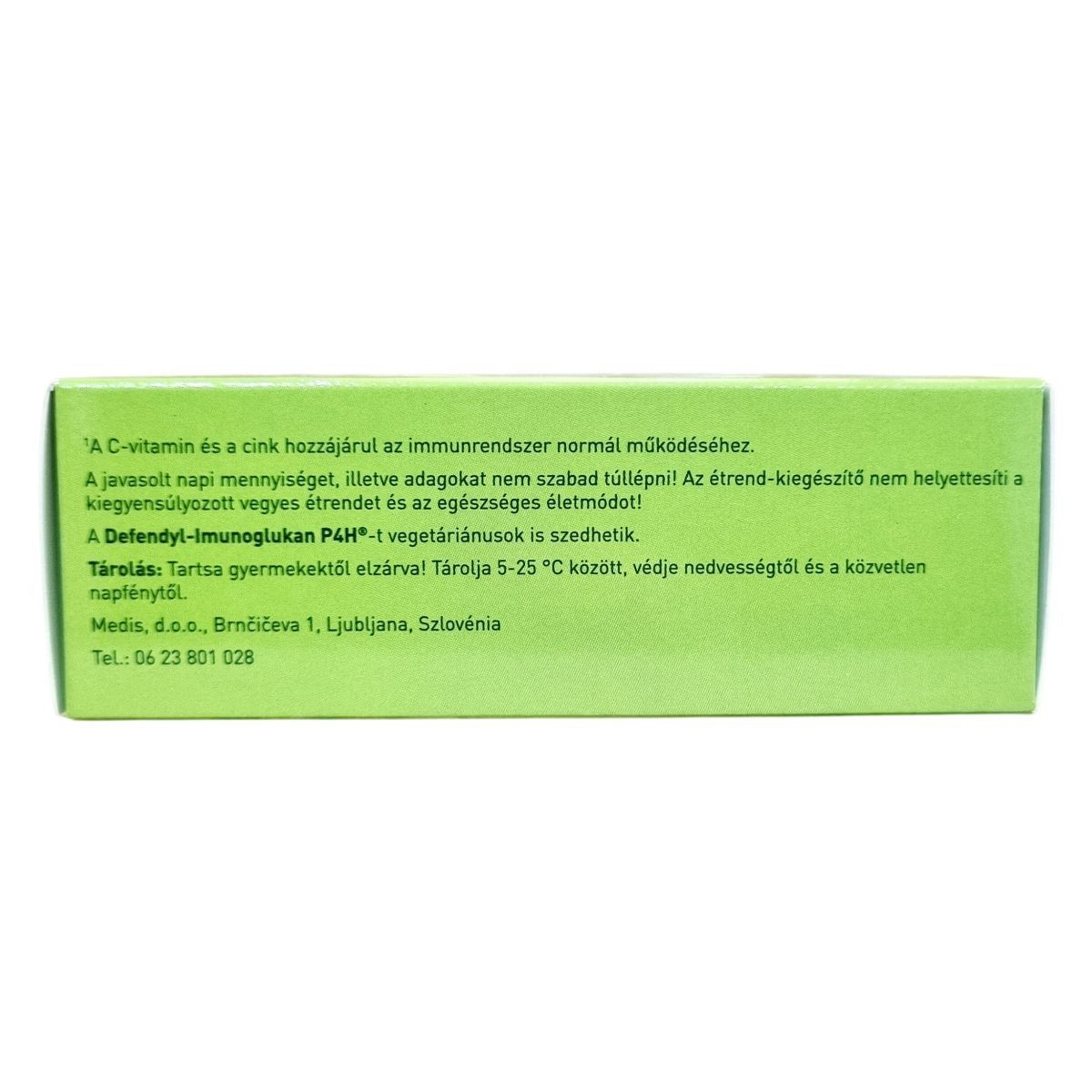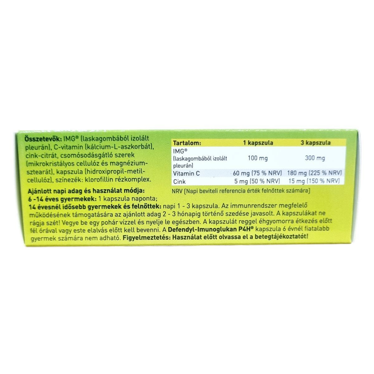 A Defendyl Imunoglukan P4H® kapszula 30 darabos kiszerelésű készítmény, mely IMG®-et (laskagombából izolált pleurán), C-vitamint és cinket tartalmaz. A vitaminok a napi beviteli referenciaérték szerint segíthetik az immunrendszer normál működését. A termék vegetáriánusok számára is alkalmas. Az adagoláskor ügyelni kell arra, hogy a kapszulákat egészben kell lenyelni, és az ajánlott adagot nem szabad túllépni. 6 év alatti gyermekeknek nem javasolt a készítmény használata.