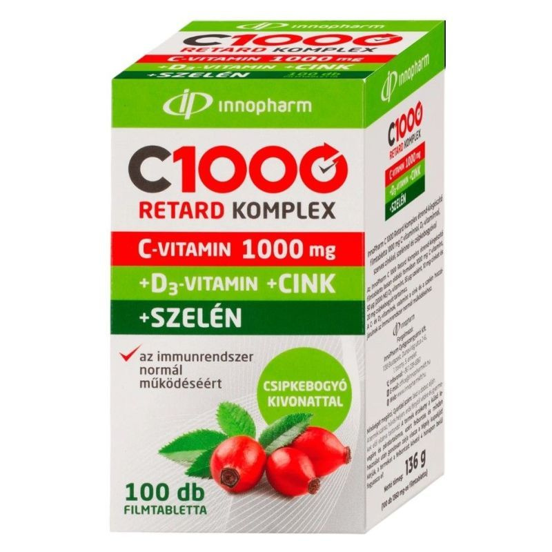 Az InnoPharm C1000 Retard Komplex lassan oldódó formában 1000mg C-vitamint, 50µg (2000 NE) D3-vitamint, 55 µg szelént, 10 mg szerves cinket 20 mg és csipkebogyót tartalmaz.