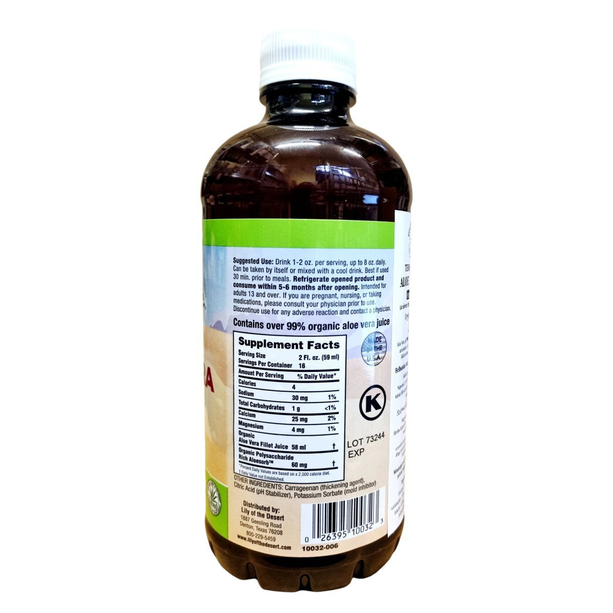A Lily of the desert Aloe Vera Gel egy természetes étrend-kiegészítő, amely több mint 99% organikus aloe vera juice-t tartalmaz. A termék a saját organikus földjeikről származó aloe növényekből készül, amelyeket saját létesítményeikben dolgoznak fel és palackoznak, így biztosítva a legmagasabb minőségi szabványokat. Az Aloesorb™ technológia révén a termék magas minőségű aloe poliszacharidokat tartalmaz, amelyek hozzájárulhatnak a tápanyagok felszívódásának javításához, az emésztés és a gyomor pH egyensúlyának támogatásához, valamint az immunrendszer egészségének fenntartásához. A termék aloin-mentes, allergénmentes, BPA-mentes, természetesen gluténmentes, GMO-mentes és vegán. A színe és állaga szezonálisan változhat, de ez nem befolyásolja a minőségét.