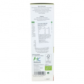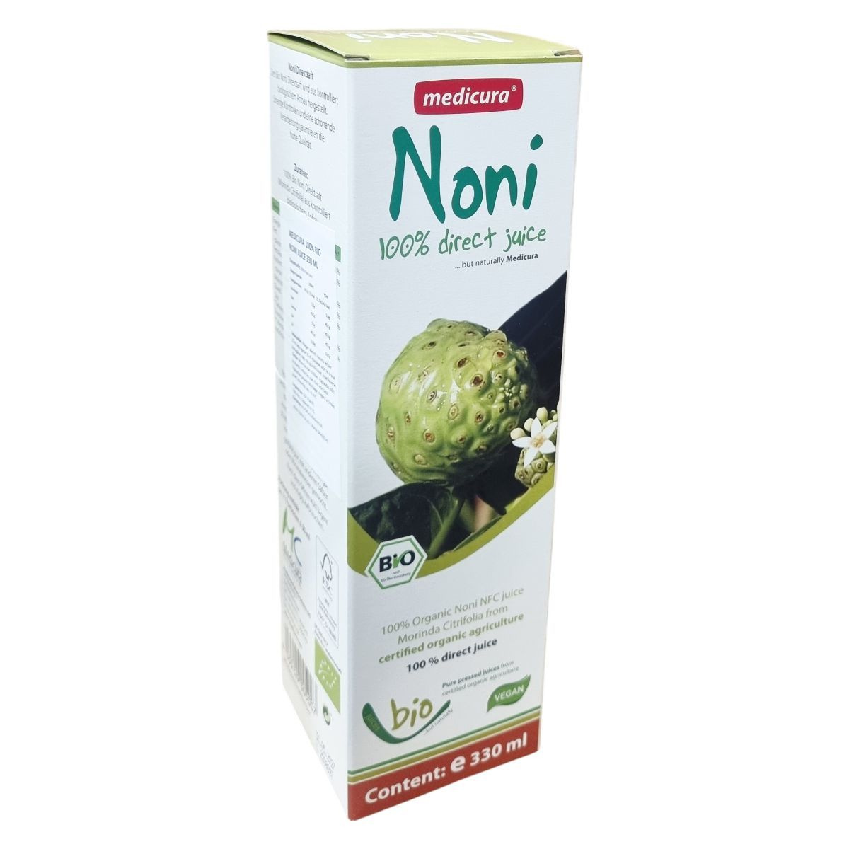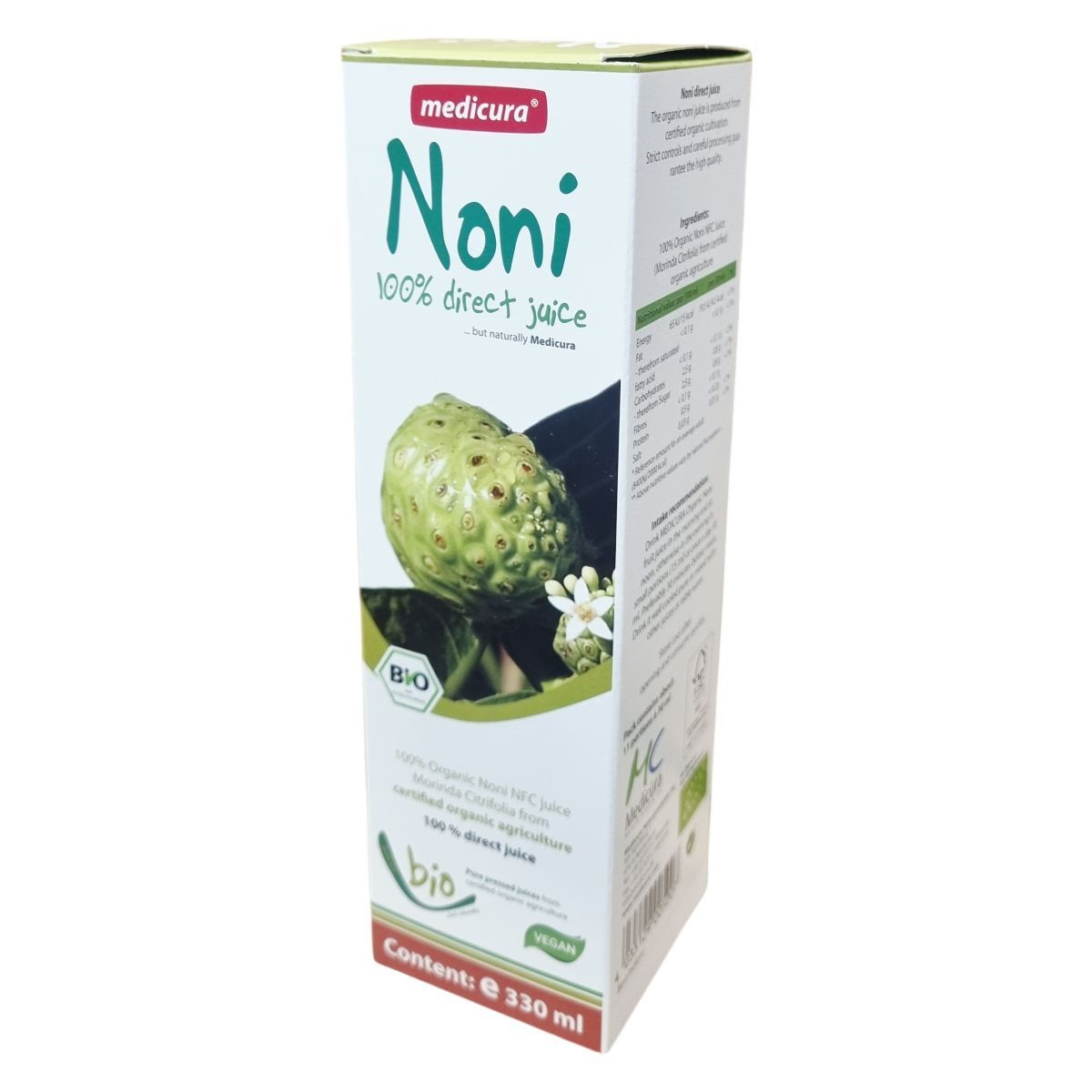 A Medicura Noni bio noni direktlé szigorú minőségellenőrzés és kíméletes feldolgozás eredményeként készül, hogy megőrizze természetes összetevőit. A termék nem tartalmaz hozzáadott anyagokat, kizárólag a Morinda Citrifolia gyümölcs friss levét tartalmazza, amely garantáltan organikus gazdálkodásból származik. A kevesebb, mint 0,1 g zsírtartalom mellett az ital alacsony energiatartalmú, könnyen beilleszthető a mindennapi táplálkozásba. A csomag körülbelül 11 adag 30 ml-es részt tartalmaz, melyeket a felbontás után hűtve kell tárolni. A termék vegán és bio minősítésű, a minőségellenőrzéseket a HU-ÖKO-01/Biokontroll felügyeli. A gyártást a német Medicura Naturprodukte AG végzi, forgalmazása az ODP Vital Kft. feladata. A termék FSC MIX csomagolású, támogatva a felelős erdőgazdálkodást.