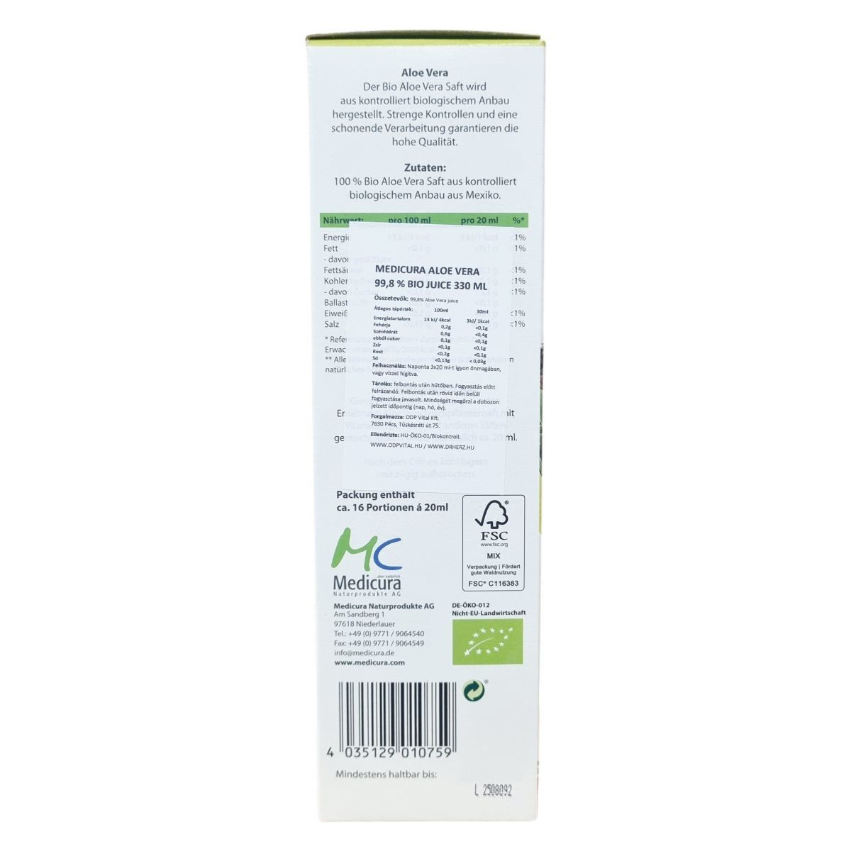 A Medicura Aloe Vera 100%-ban friss növényi lé formájában kínált termék, amely Barbadensis Miller aloe verából készül ellenőrzött biológiai termesztésből, elsősorban Mexikóból származó alapanyagból. A gyártás során szigorú minőségellenőrzést és kíméletes feldolgozást alkalmaznak a magas minőség biztosítása érdekében. A termék fő összetevője a 99,8%-os aloe vera lé. A csomagolás környezetbarát FSC tanúsítvánnyal rendelkező, vegyes forrásból származó anyagokból készül, amely elősegítheti a fenntartható erdőgazdálkodást. Az ajánlott napi adag háromszor 20 ml, amely önmagában vagy más italokhoz keverve fogyasztható. A termék tárolásánál fontos betartani a hűtést felbontás után, valamint a gyors fogyasztást a minőség megőrzése érdekében. A termék kizárólag biológiai gazdálkodásból származó összetevők felhasználásával készül, és a német-biológiai szabványoknak megfelelő engedélyekkel rendelkezik, melyeket a megfelelő hatóságok ellenőriznek és tanúsítanak.