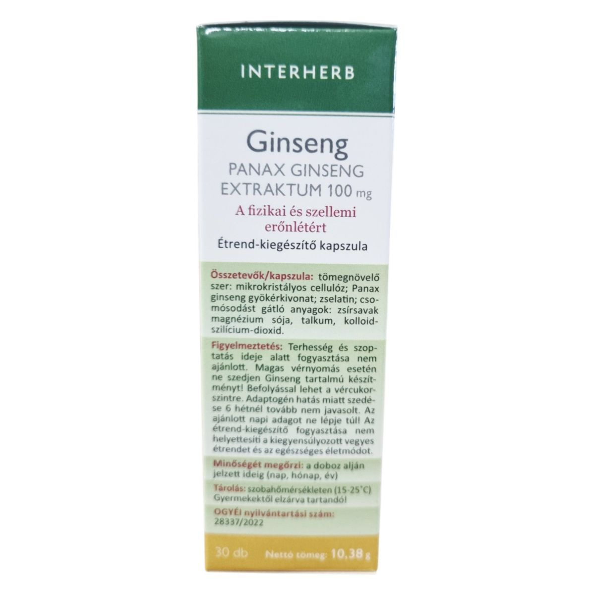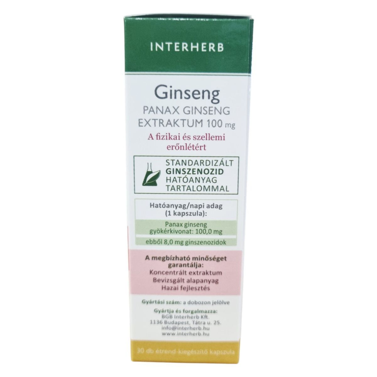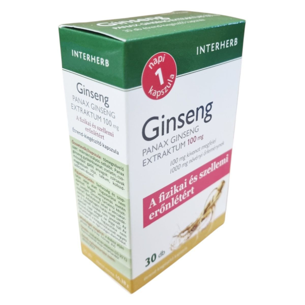 Az INTERHERB Ginseng PANAX GINSENG EXTRAKTUM 100 mg kapszula a fizikai és szellemi erőnlét támogatására szolgálhat. A termék standardizált ginszenoid hatóanyag tartalommal rendelkezik, amely a Panax ginseng gyökérkivonatának köszönhetően segíthet a testi-lelki egészség megőrzésében. A Távol-Keleten több mint 2000 éve alkalmazott ginseng hozzájárulhat a teljesítőképesség fenntartásához. A kapszula fogyasztását fokozott fizikai- és szellemi igénybevétel esetén ajánlják. A termék megbízható minőségét a koncentrált extraktum, bevizsgált alapanyag és hazai fejlesztés garantálja.