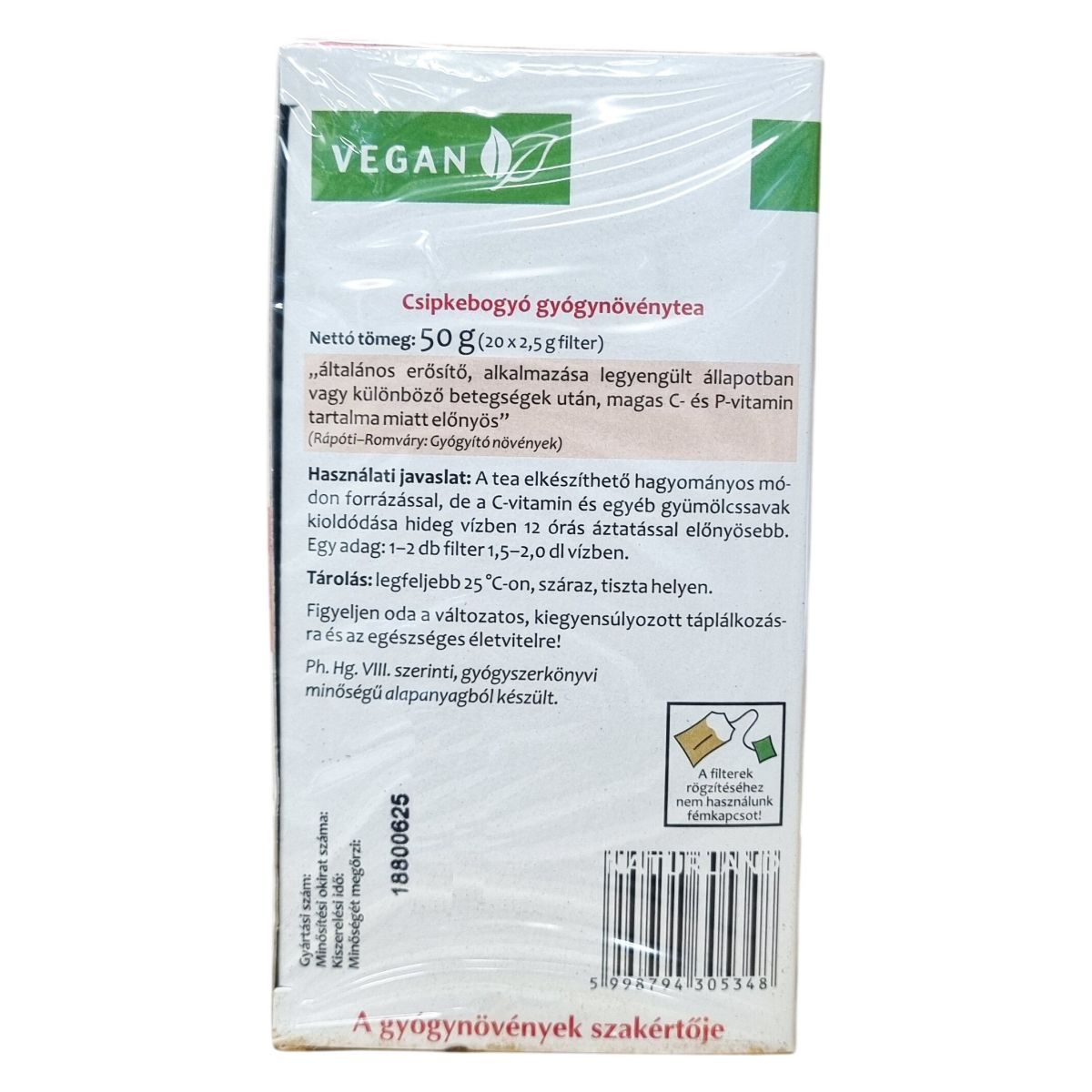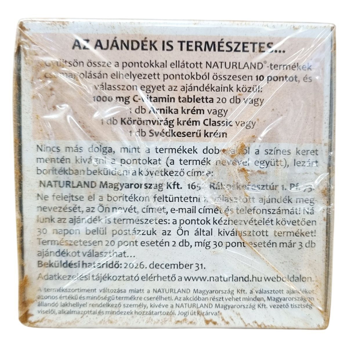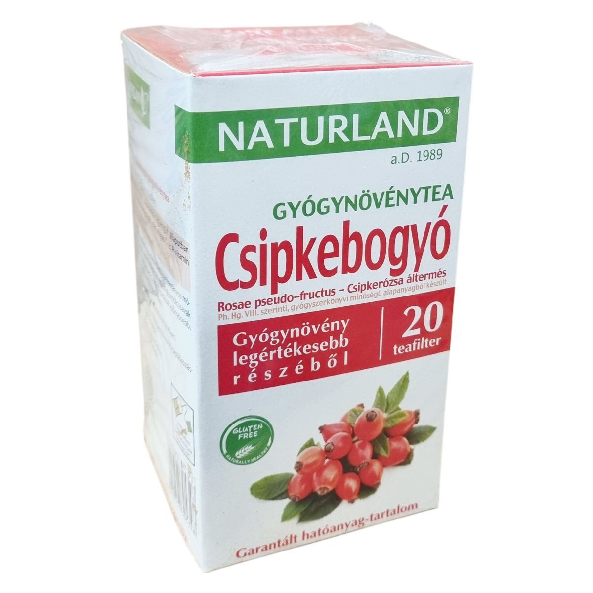 A Naturland csipkebogyó gyógynövénytea Ph. Hg. VIII. szerinti, gyógyszerkönyvi minőségű alapanyagból készül a csipkebogyó gyógynövény legértékesebb részéből. A termék gluténmentes és vegán, garantált hatóanyag-tartalommal rendelkezik. Az ajándékpont-gyűjtő akcióban a termék csomagolásán található pontokkal természetes kiválasztott ajándékokra lehet jogosult a vásárló, mint például C-vitamin tabletta vagy különböző natúrszerek. Az akció részletei és a felhasználási feltételek a csomagoláson és a Naturland weboldalán érhetők el. A termékkel való vásárlás magyar munkahelyeket támogat.