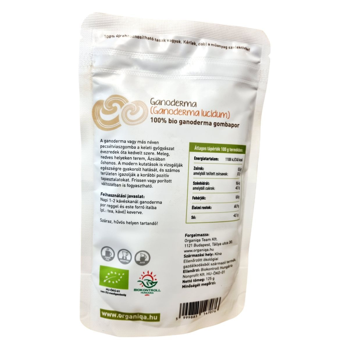 A Ganoderma por, más néven pecsétviaszgomba, Ázsiában őshonos, meleg, nedves helyeken terem. A termék 100% bio ganoderma gombaport tartalmaz, amelyet ellenőrzött ökológiai gazdálkodásból származó alapanyagokból készítenek. A tasak 100% újrahasznosítható, így környezetbarát választás. A terméket a Biokontroll Hungária Nonprofit Kft. ellenőrzi, és a származási helye Kína. A termék forgalmazója az Organiqa Team Kft., amelynek székhelye Budapest, Tállya utca 30.