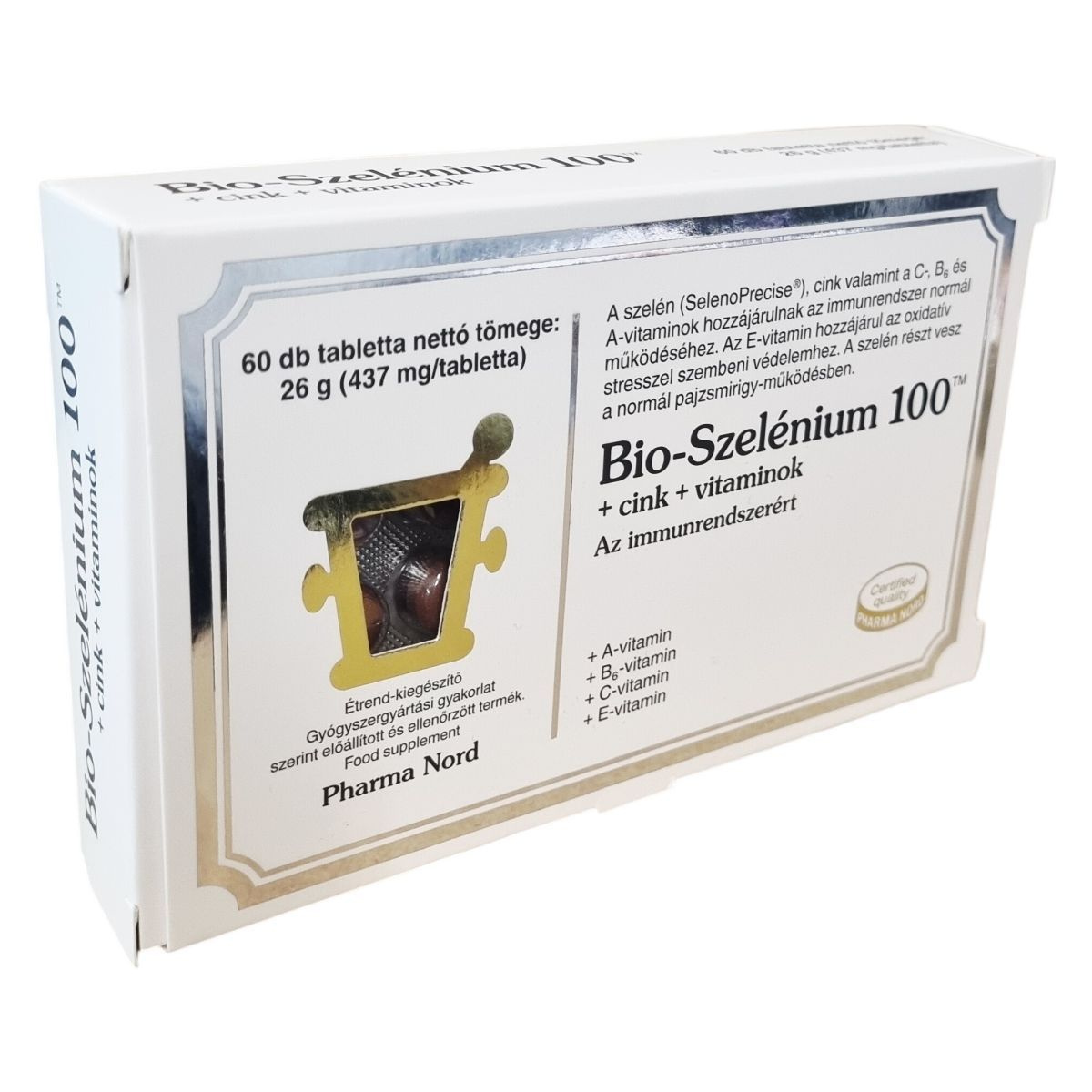 A Bio-Szelénium 100™ + cink + vitaminok tabletta gyógyszergyártási gyakorlat szerint előállított és ellenőrzött étrend-kiegészítő, melyet Pharma Nord gyárt. A szelén a SelenoPrecise® márkanevet viseli, amely szabadalmaztatott szelénes élesztő alapanyag. A készítmény vegánok és vegetáriánusok számára is alkalmas. A termék tablettánként 437 mg-os tömegű, 60 tablettás kiszerelésben kapható, nettó tömege 26 g. A készítmény a szelén mellett cinket és az immunrendszer támogatásáért fontos A-, B6-, C- és E-vitaminokat tartalmaz, melyek hozzájárulhatnak az immunrendszer normál működéséhez, valamint az oxidatív stressz elleni védelemhez. A szelén szerepet játszhat a normál pajzsmirigy-működésben is. A termék tárolása szobahőmérsékleten, napfénytől védve ajánlott. A minőségmegőrzési időpont a doboz alján feltüntetett időpontig garantált.