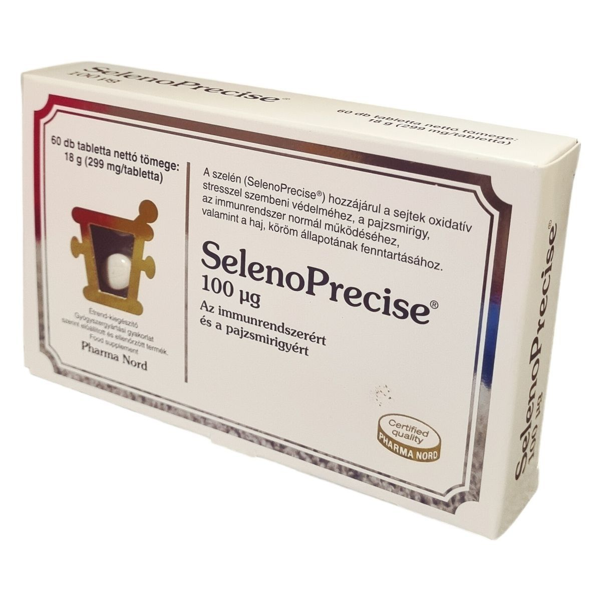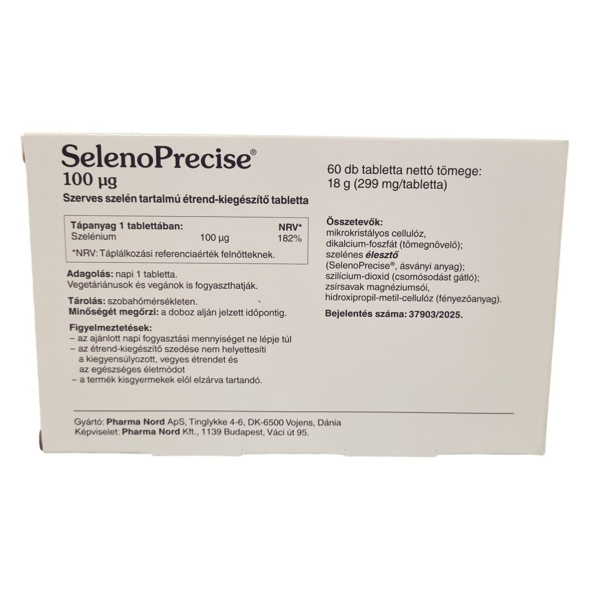 A SelenoPrecise® szelént tartalmazó étrend-kiegészítő tabletták szerves forrásból biztosítják a szelént, amely hozzájárulhat a sejtek oxidatív stresszel szembeni védelméhez, a pajzsmirigy és az immunrendszer normál működéséhez, továbbá a haj és köröm egészségének fenntartásához. A termék alkalmazása napi egy tabletta formájában ajánlott, mely 299 mg tömegű. A készítmény mikrokristályos cellulóz, dikalcium-foszfát, szelénes élesztő, szilícium-dioxid, zsírsavak magnéziumsói és hidroxipropil-metil-cellulóz összetevőket tartalmaz. Gyógyszergyártási gyakorlat szerint előállított, ellenőrzött minőségű termék, vegánok és vegetáriánusok is fogyaszthatják. Tárolása szobahőmérsékleten javasolt, és a minőségét a csomagoláson jelzett időpontig megtartja.