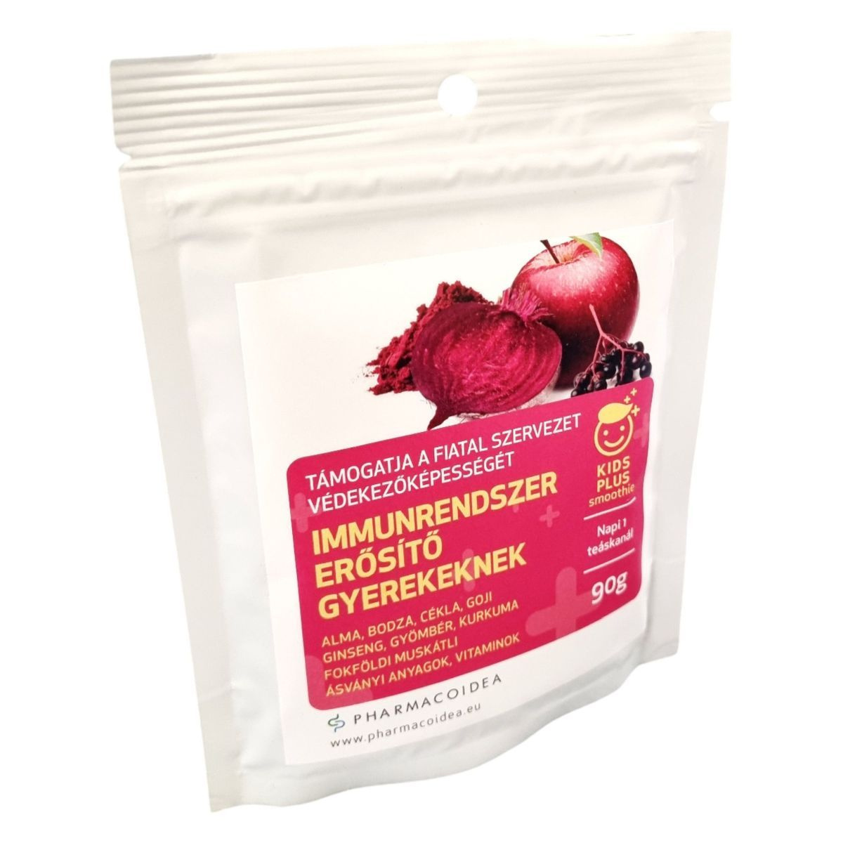 A Pharmacoidea Kids Plus smoothie egy gyermekek számára készült étrend-kiegészítő porkeverék, amely különféle természetes összetevőket tartalmaz, mint az alma, bodza, cékla, goji, ginseng, gyömbér, kurkuma és fokföldi muskátli. Ezek az összetevők hozzájárulhatnak az immunrendszer normál működéséhez, a légzőrendszer egészséges működéséhez, valamint a gyermekek egészséges fejlődéséhez. A termék napi ajánlott mennyisége 3 g, amelyet gyümölcslébe, joghurtba vagy tejbe keverve javasolt fogyasztani. A termék nem helyettesíti a kiegyensúlyozott étrendet és az egészséges életmódot.
