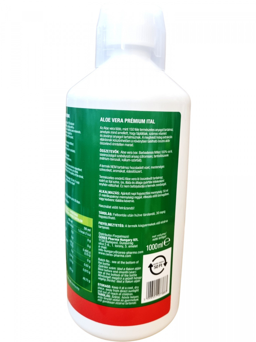 Az Aloe Vera Premium ital több mint 150 természetes hatóanyagot tartalmaz, köztük vitaminokat, ásványi anyagokat és nyomelemeket. A hideg extrakciós eljárás biztosítja, hogy az aktív összetevők épek maradjanak, így a termék hozzájárulhat a szervezet mindennapi vitalitásához és a bélrendszer megfelelő működéséhez. Magas aloe vera gél-tartalma miatt frissítő és természetes étrend-kiegészítő, amely támogatja a hidratáltságot, és kíméletesen segítheti az emésztést.