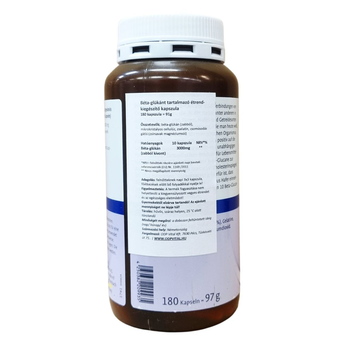 A béta-glükán kapszula természetes eredetű összetevőket tartalmaz zabból, és kapszula formában kínálja az étrend-kiegészítést. A napi ajánlott adag 10 kapszula, amelyben összesen 3000 mg béta-glükán található. A termék fogyasztása támogathatja az egészséges életmódot, de nem helyettesíti a változatos és kiegyensúlyozott étrendet. A kapszulák készítéséhez mikrokristályos cellulózt, zselatint, valamint csomósodásgátló anyagot, zsírsavak magnéziumsóit használják fel. Tárolása fénytől védve, száraz, 25 °C alatti környezetben javasolt. A termék származási helye Németország, és a forgalmazó az ODP Vital Kft. A mindennapos fogyasztásra ajánlott adagolásokat be kell tartani, és gyermekek elől elzártan kell tartani.
