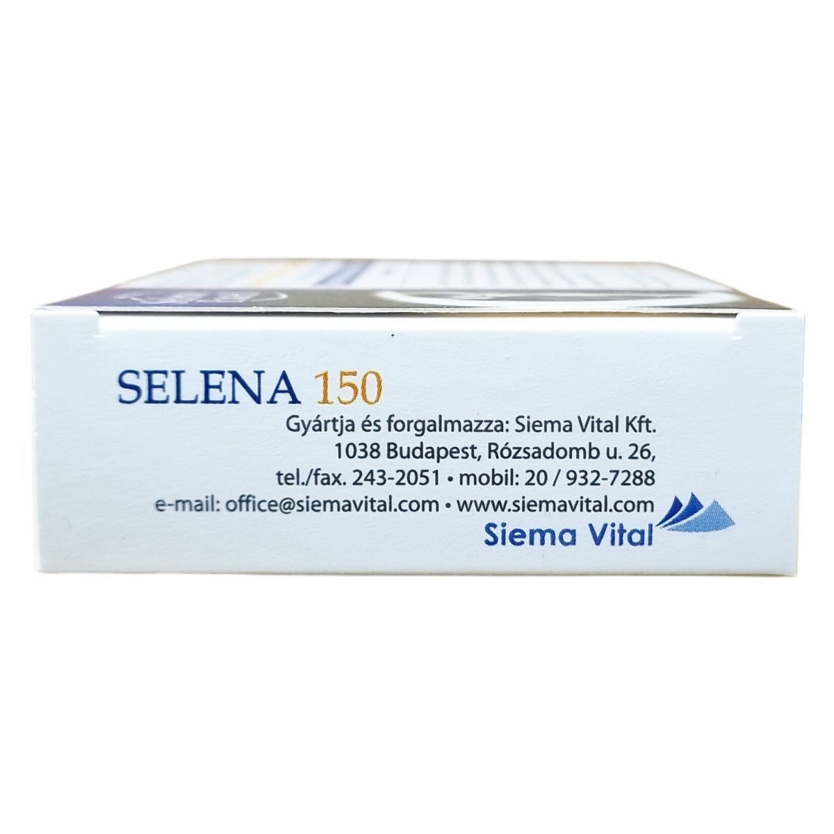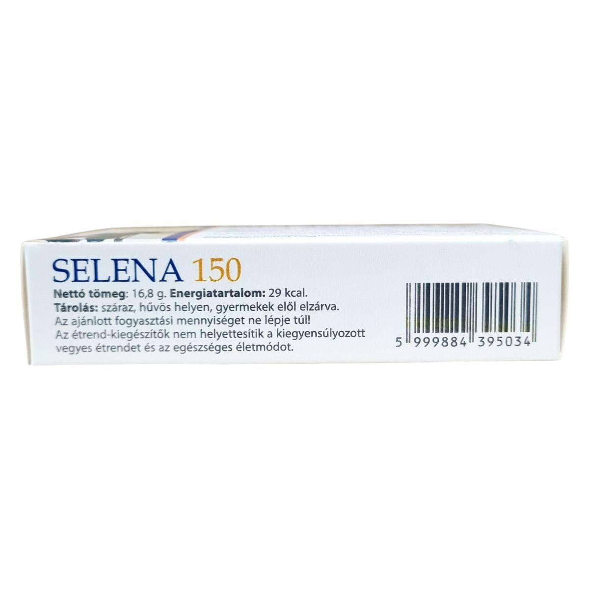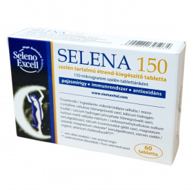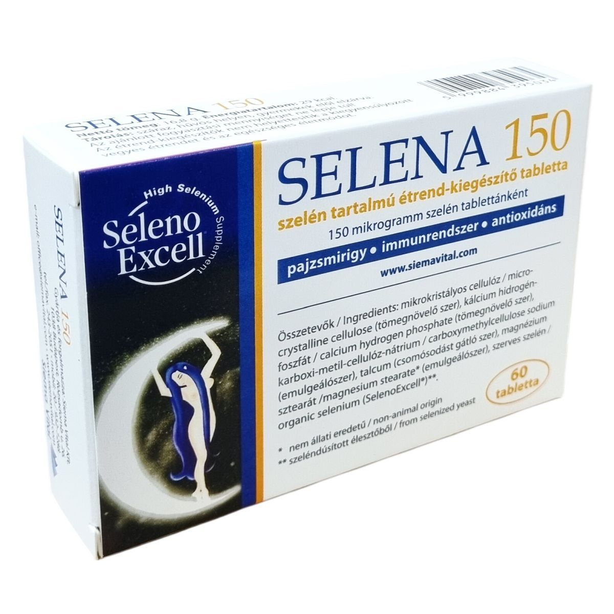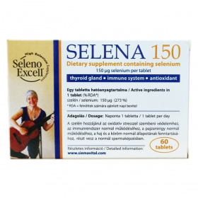 A SELENA 150 egy étrend-kiegészítő tabletta, melynek egy tablettája 150 mikrogramm szelént tartalmaz, szeléndúsított élesztőből származó szerves formában (SelenoExcell®). A termék nem tartalmaz hozzáadott cukrot, sót, keményítőt, laktózt, glutént, szintetikus ízesítőt, színezéket és tartósítószert. A szelén hozzájárulhat az oxidatív stresszel szembeni védelemhez, az immunrendszer és a pajzsmirigy normál működéséhez, a haj és a köröm normál állapotának fenntartásához, valamint részt vehet a normál spermaképzésben. A tabletták száraz, hűvös helyen tárolandók, gyermekektől elzárva. A terméket naponta egy tabletta bevétele javasolt.