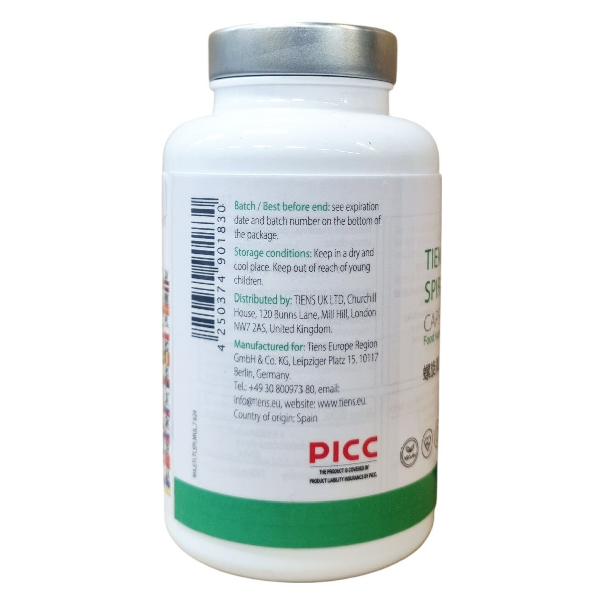 A Tiens Spirulina kapszulák szárított spirulina porból készülnek, amely hidroxi-propil-metil-cellulóz kapszula héjba van csomagolva. A termék kapszulánkénti mennyisége biztosítja az ajánlott hatóanyagot a napi adagban. Javasolt az adagolás pontos betartása, valamint a változatos táplálkozás és életmód fenntartása. A gyártás Spanyolországban történik, és a termék termékfelelősségi biztosítással rendelkezik.