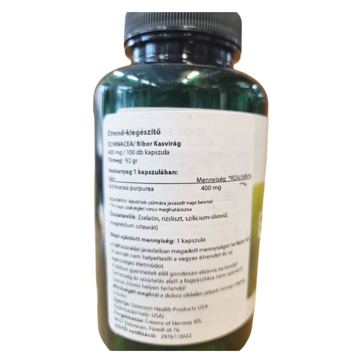 A Swanson Echinacea étrend-kiegészítő 100 kapszulás kiszerelésben kapható, és kapszulánként 400 mg Echinacea purpurea-t tartalmaz. Az echinacea, más néven bíbor kasvirág, hozzájárulhat az immunrendszer támogatásához. A termék összetevői között megtalálható a zselatin, rizsliszt, szilícium-dioxid és magnézium-sztearát. Az étrend-kiegészítő nem helyettesíti a vegyes étrendet és az egészséges életmódot, és terhesség, valamint szoptatás alatt nem ajánlott a fogyasztása. A terméket száraz, hűvös helyen kell tárolni, és gyermekek elől elzárva tartani. A Swanson Health Products által gyártott terméket a Creams of Norway Kft. forgalmazza Magyarországon.