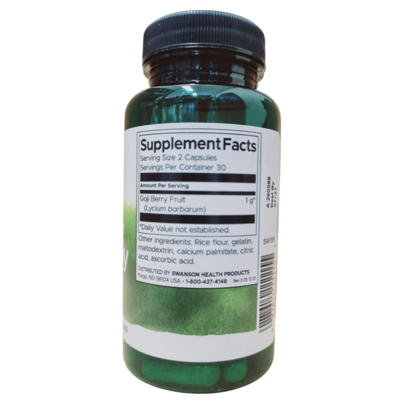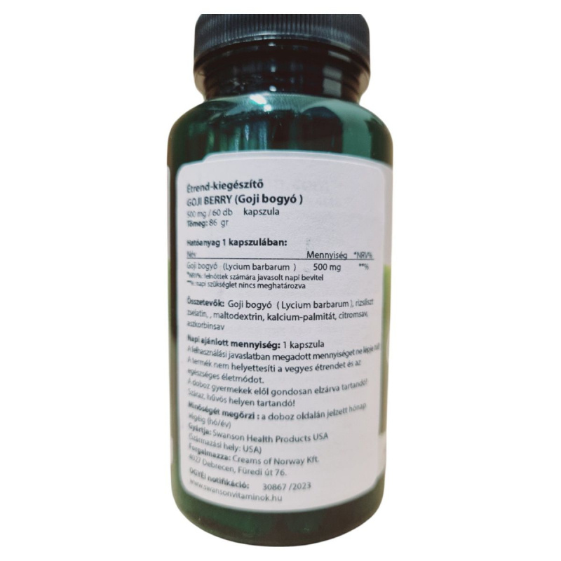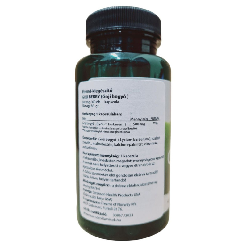 A Swanson Health Products GOJI BERRY étrend-kiegészítő kapszula 500 mg Goji bogyó kivonatot tartalmaz, amelyet a Lycium barbarum növényből nyernek. A termék célja, hogy támogassa a szervezet általános jólétét és kiegészítse a mindennapi étrendet. A kapszula további összetevői közé tartozik a rizsliszt, zselatin, maltodextrin, kalcium-palmitát, citromsav és aszkorbinsav. A terméket a Swanson Health Products gyártja az USA-ban, és a Creams of Norway Kft. forgalmazza Magyarországon. Az étrend-kiegészítő használatakor fontos betartani az ajánlott napi mennyiséget, és gondoskodni arról, hogy a termék gyermekek elől elzárva legyen tárolva.