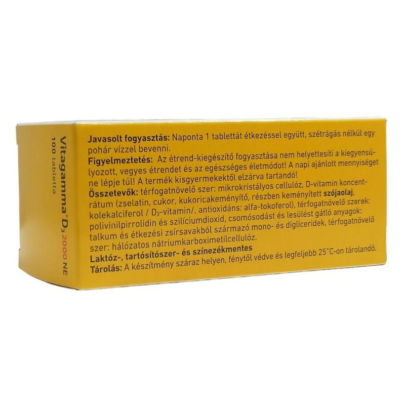 A Vitagamma D3 2000 NE tabletta étrend-kiegészítő készítmény, mely 2000 nemzetközi egység D3-vitamint (kolekalciferol) tartalmaz.