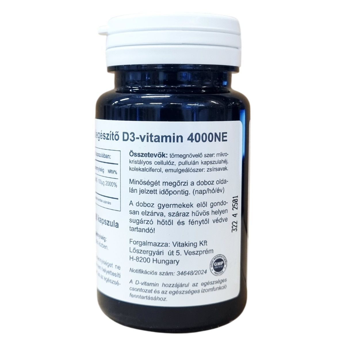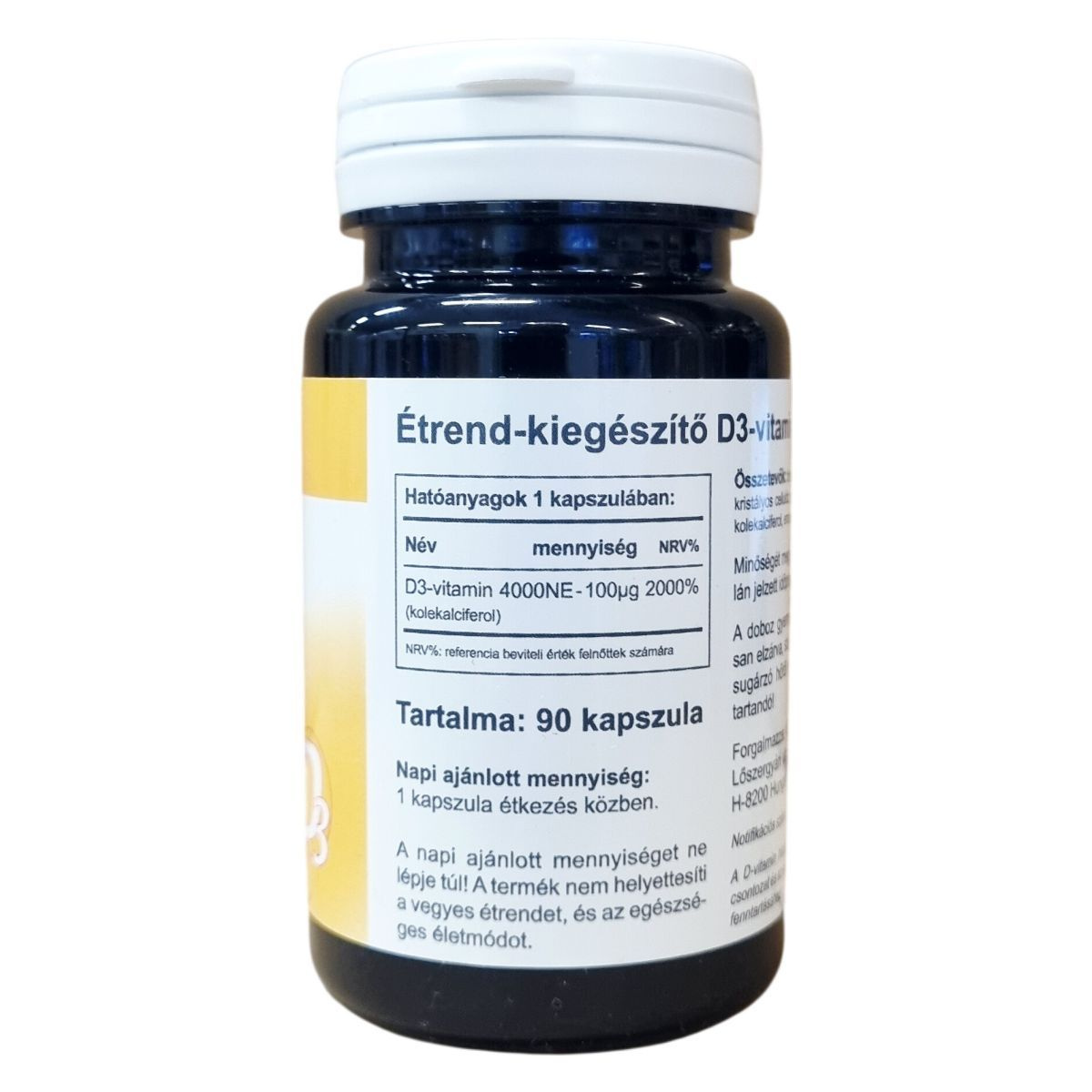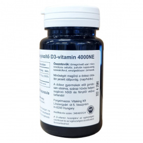 A D3-vitamin étrend-kiegészítő 4000NE erősségű termék, amely kapszula formájában kapható, összesen 90 darabot tartalmaz a csomagolás. A termék fő hatóanyaga a kolekalciferol, amely egy fontos vitaminként járulhat hozzá a szervezet általános egészségéhez, különösen az immunrendszer erősítéséhez, valamint az egészséges csontozat és izomfunkció fenntartásához. Az összetevők között található továbbá mikrokristályos cellulóz tömegnövelő szerként, emulgeálószerként pedig zsírsavak szolgálnak. A kapszulahéj pullulánból készül. A terméket szobahőmérsékleten és fénytől védett helyen javasolt tárolni, és gyermekektől elzártan tartani. A termék nem helyettesíti a változatos étrendet és egészséges életmódot, valamint az ajánlott napi adag betartása fontos az egészség megőrzése érdekében.