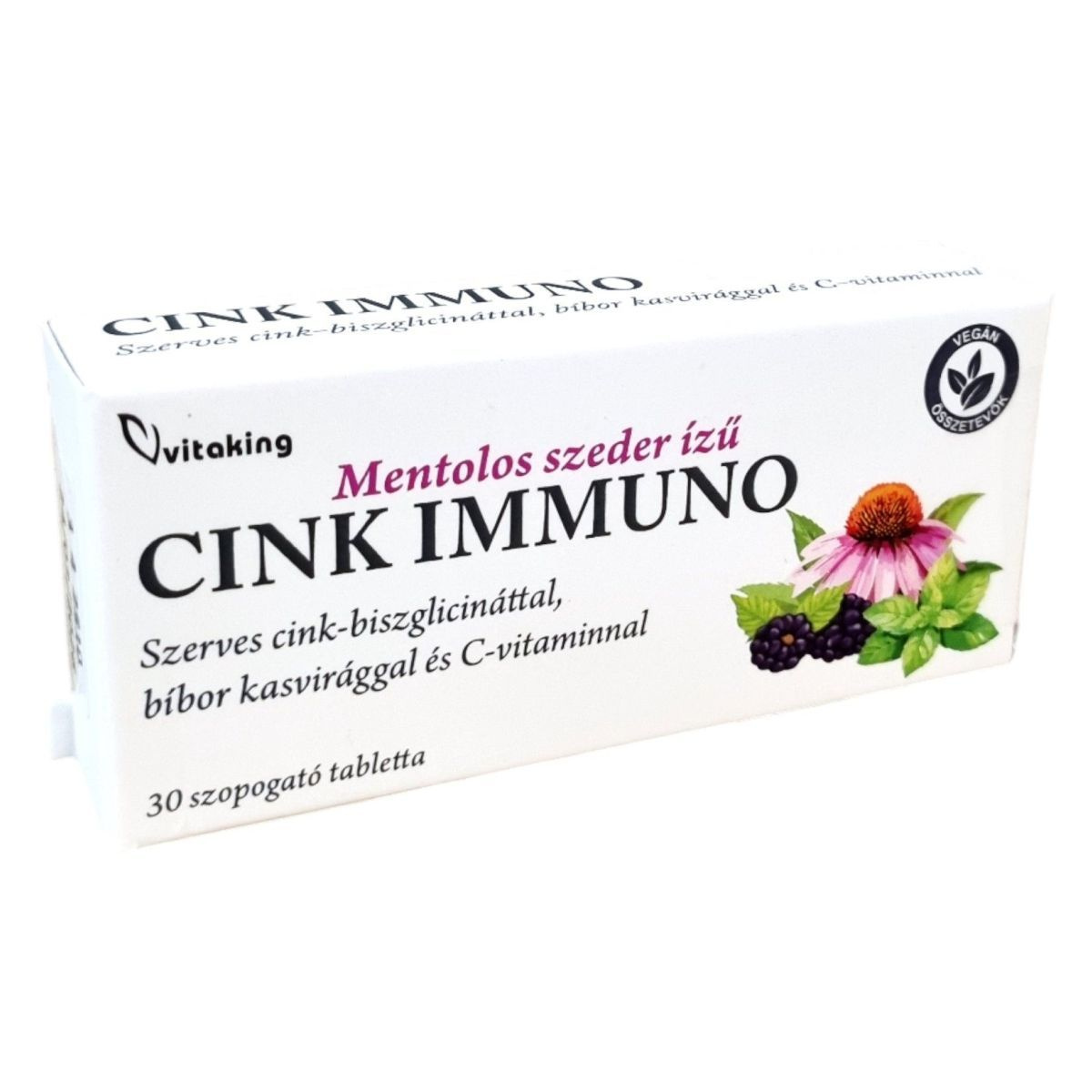 A Vitaking CINK IMMUNO szopogató tabletta mentolos szeder ízű, és szerves cink-biszglicináttal, bíbor kasvirággal és C-vitaminnal készült. A C-vitamin és a cink hozzájárulhat az immunrendszer normál működéséhez, míg az Echinacea purpurea (bíbor kasvirág) támogathatja a szervezet védekező rendszerének megfelelő működését. A termék 30 tablettát tartalmaz, és édesítőszerrel készült. A napi ajánlott mennyiséget ne lépje túl, és terhesség, valamint szoptatás alatt nem ajánlott a fogyasztása.
