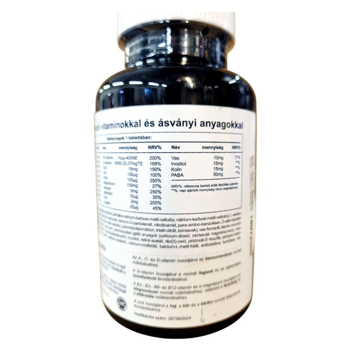 emulgeálószerek (mikrokristályos cellulóz, térhálós nátrium-karboxi-metil-cellulóz), magnézium-oxid, dikalcium-foszfát, kalcium-karbonát, kalcium-D-pantotenát, nikotinamid, para-amino-benzoesav, D-alfa-tokoferil-acetát, kolin-bitartarát, stabilizátorok (hidroxi-propil-metil-cellulóz, polivinil-alkohol, talkum), cink-oxid, csomósodást gátló anyag: polivinil-alkohol.
