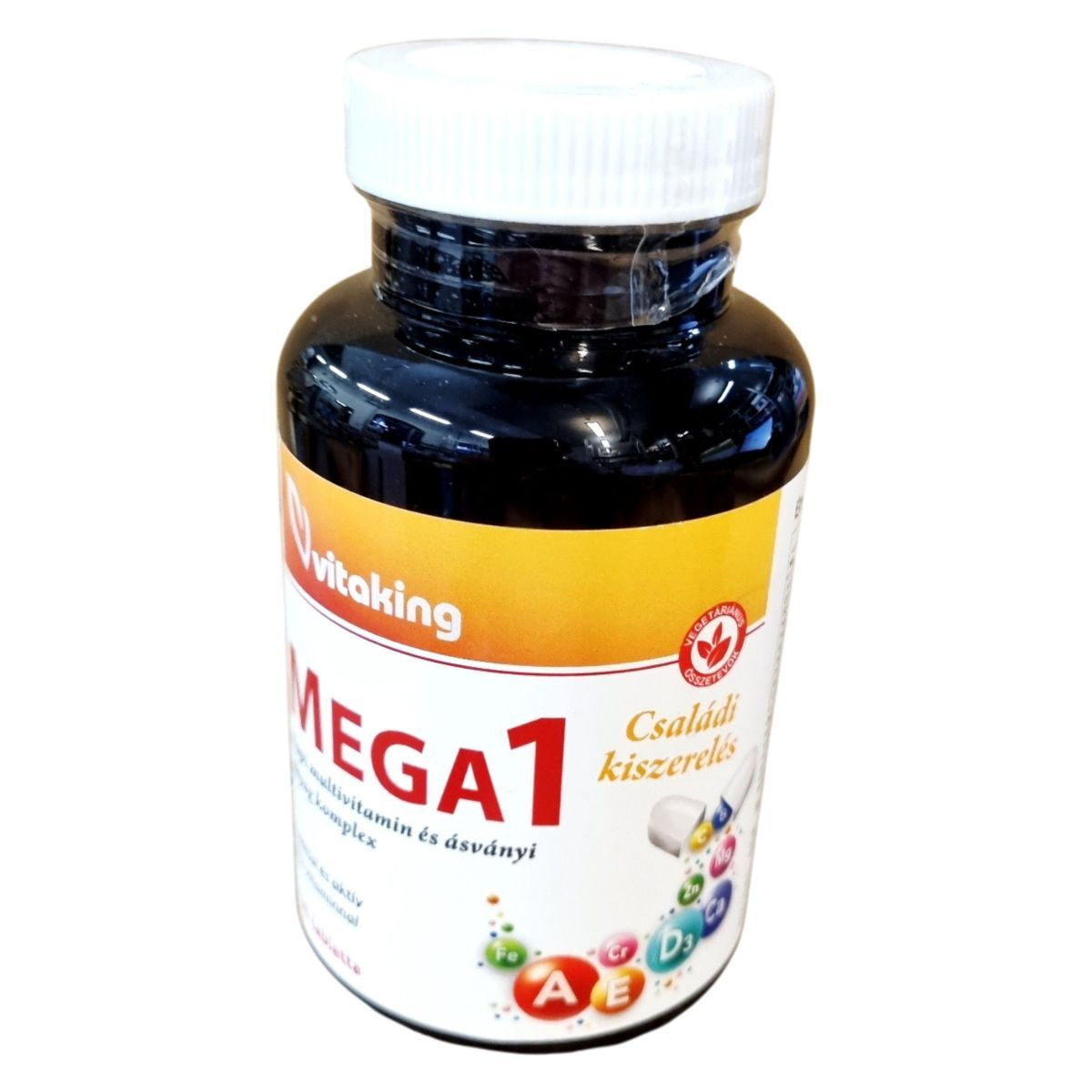A Vitaking MEGA1 multivitamin és ásványi anyag komplex egy étrend-kiegészítő, amely különböző vitaminokat és ásványi anyagokat tartalmaz. A termék fóliával és aktív B12-vitaminnal van ellátva, amely metilkobalamin formában található meg. A termék célja, hogy támogassa a szervezet egészségét és hozzájáruljon a napi vitamin- és ásványi anyag szükséglet kielégítéséhez. Az összetevők között megtalálhatóak különböző emulgeálószerek, stabilizátorok és csomósodást gátló anyagok is.