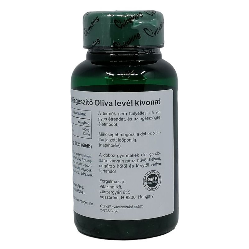 Az olajfa levél 98 értékes összetevőt tartalmaz. Egyik legfőbb összetevője az oleuropein. Az oleuropein antioxidáns hatású tápanyag, így megvédheti szervezetünket, sejtjeinket a káros oxidatív hatásoktól. Az oleuropein szervezetünkbe bekerülve elenolsavvá alakul át enzimek hatására, mely pozitív hatások széles spektrumával rendelkezik az emberi szervezet egészére. Az olajfalevél-kivonat antioxidáns tulajdonságú, továbbá hozzájárul: a szervezetben zajló káros oxidatív folyamatok, így az öregedés gátlásához, az immunrendszer egészséges működésének feltételeinek javításához, a keringési rendszer (szív és érrendszer) megfelelő működéséhez, elősegíti a vérkoleszterin, és a vércukorszint egészséges arányának fenntartását. Az olajfa levél kivonat rendszeres szedése hozzásegít ahhoz, hogy közérzetünk tartósan javuljon, az immunrendszeri betegségekkel (pl. influenza) szemben nagyobb legyen ellenálló képességünk. A termék sztenderdizált 15% oleuropeint tartalmaz. Napi ajánlott mennyiség: 1 kapszula A felhasználási javaslatban megadott mennyiséget ne lépje túl! A termék nem helyettesíti a vegyes étrendet és az egészséges életmódot. A doboz gyermekek elől gondosan elzárva tartandó!