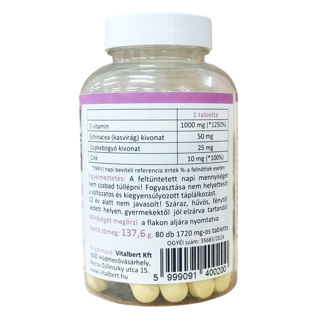 Hosszan tartó hatás révén a készítmény C-vitamin tartalma fokozatosan szabadul fel a szervezetben. A C-vitamin hozzájárul az ideg- és immunrendszer normál működéséhez, a sejtek oxidatív stresszel szembeni védelméhez. Segíti a kollagénképződést, ezen keresztül a bőr és az erek normál állapotának megőrzését. A cink támogatja az immunrendszer működését, hozzájárul az egészséges csontrendszer és látás fenntartásához, a haj, bőr és a köröm optimális állapotának megőrzéséhez, valamint elősegíti az egészséges szellemi működést. Nettó tömeg: 137,6 g, 80 db 1720 mg-os tabletta. Nem tartalmaz semmiféle felesleges adalékanyagot. (NRV) napi beviteli referencia érték %-a felnőttek esetén.