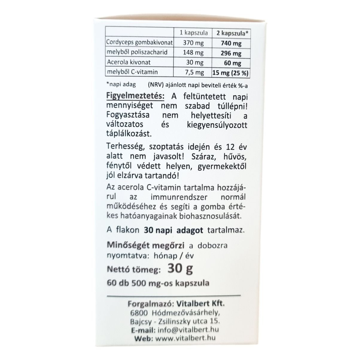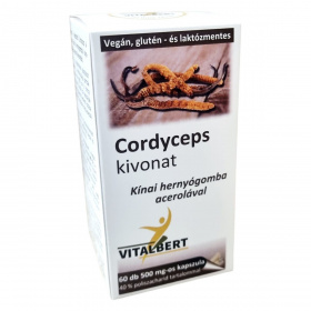A Cordyceps sinensis nevű kínai hernyógomba a Cordycipitaceae családba tartozik, főként Nepál és Kína tibeti vidékén honos. Hagyományos kínai gyógyászatban már több ezer éve alkalmazzák, bár Európában még kevéssé ismert. A Vitalbert termék magas, 40%-os poliszacharid tartalmú kivonattal készül, mely a gomba hengeres termőtestéből származó finom por hagyományos vizes extrakciós eljárással előállított koncentrátuma. A készítmény kapszulánként 370 mg minőségi gombakivonatot és 30 mg acerola kivonatot tartalmaz, az utóbbi hozzájárulhat a C-vitamin bevitelhez, amely segítheti a gomba értékes hatóanyagainak felszívódását. Az alapanyag minőségét és tisztaságát független laboratóriumban ellenőrzik. A csomagolás 60 kapszulát tartalmaz, amely 30 napi adagnak felel meg. A termék vegán, glutén-, laktóz- és színezékmentes, valamint nem tartalmaz tartósítószert vagy egyéb adalékanyagot.