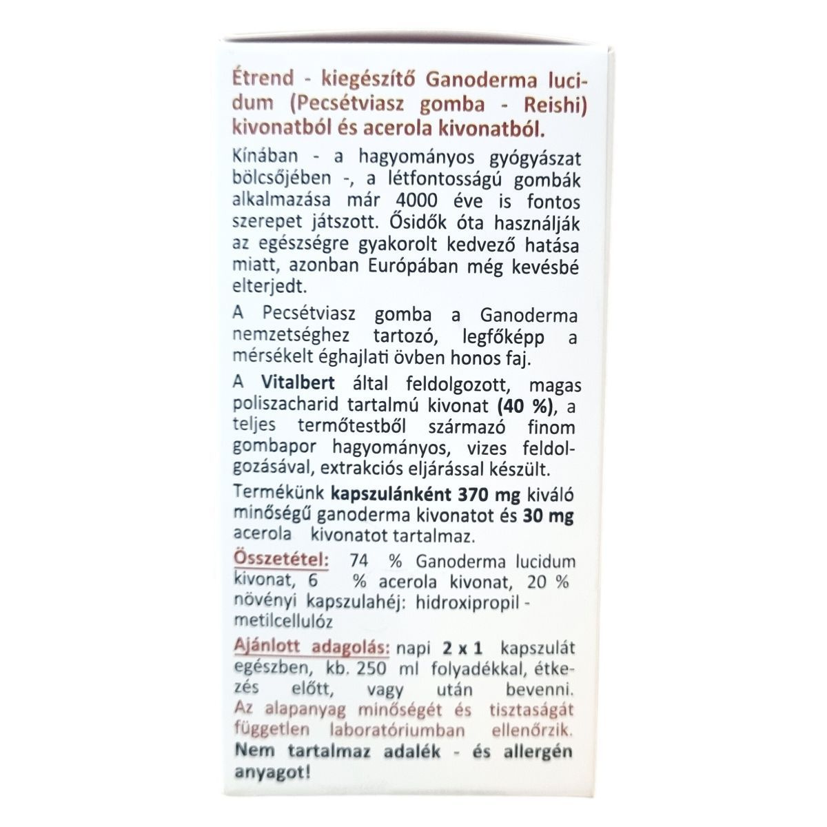 A termék prémium minőségű ganoderma lucidum (Pecsétviasz gomba, Reishi) kivonatból és acerola kivonatból készül. A Ganoderma nemzetséghez tartozó Pecsétviasz gomba leginkább a mérsékelt éghajlati övben honos. A Vitalbert által feldolgozott kivonat a teljes termőtestből készül, hagyományos vizes extrakciós eljárással, amely 40% poliszacharid tartalommal rendelkezik. Az acerola C-vitamin tartalma hozzájárulhat az immunrendszer normál működéséhez és elősegítheti a gomba értékes hatóanyagainak biológiai hasznosulását. A C-vitamin napi 25%-os ajánlott beviteli értéket biztosíthat. A termék nem tartalmaz tartósítószert, színezéket vagy allergén adalékanyagokat, és független laboratóriumban ellenőrzik az alapanyag minőségét és tisztaságát. A flakon 30 napi adagot tartalmaz, a nettó tömege 30 g, 60 db 500 mg-os kapszulával.