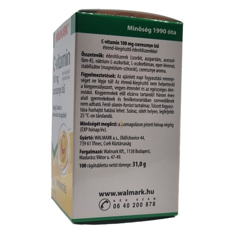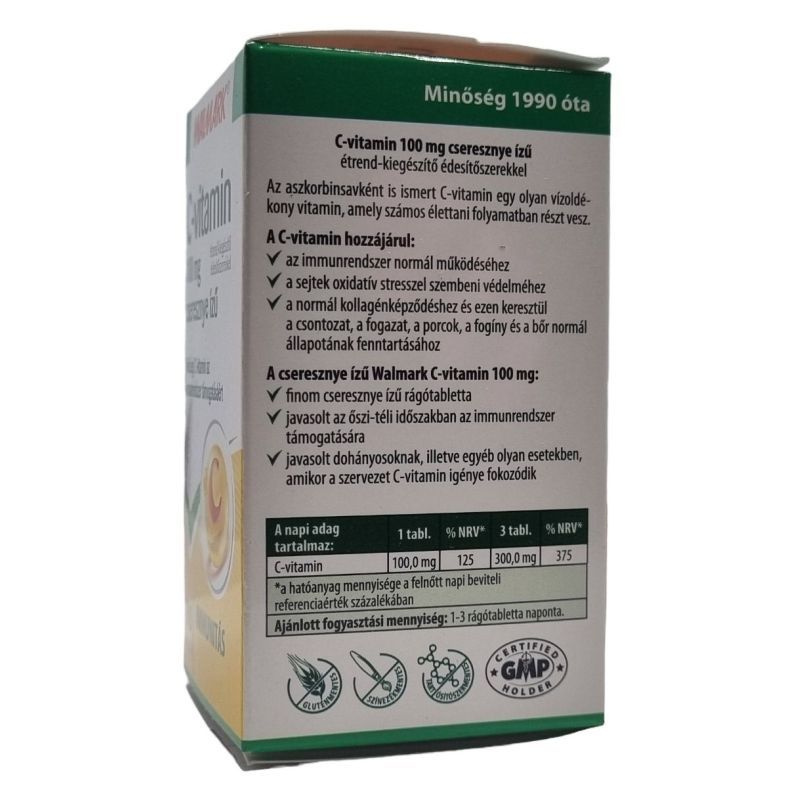 Az aszkorbinsavként is ismert C-vitamin vízoldékony vitamin, amely számos élettani folyamatban részt vesz. Hozzájárulhat az immunrendszer normál működéséhez, a sejtek oxidatív stresszel szembeni védelméhez, valamint a normál kollagénképződéshez, ezáltal támogathatja a csontozat, a fogazat, a porcok, a fogíny és a bőr normál állapotának fenntartását. Finom cseresznye ízű rágótabletta, amely javasolt az őszi-téli időszakban, valamint fokozott C-vitamin-igény esetén, például dohányosok számára.