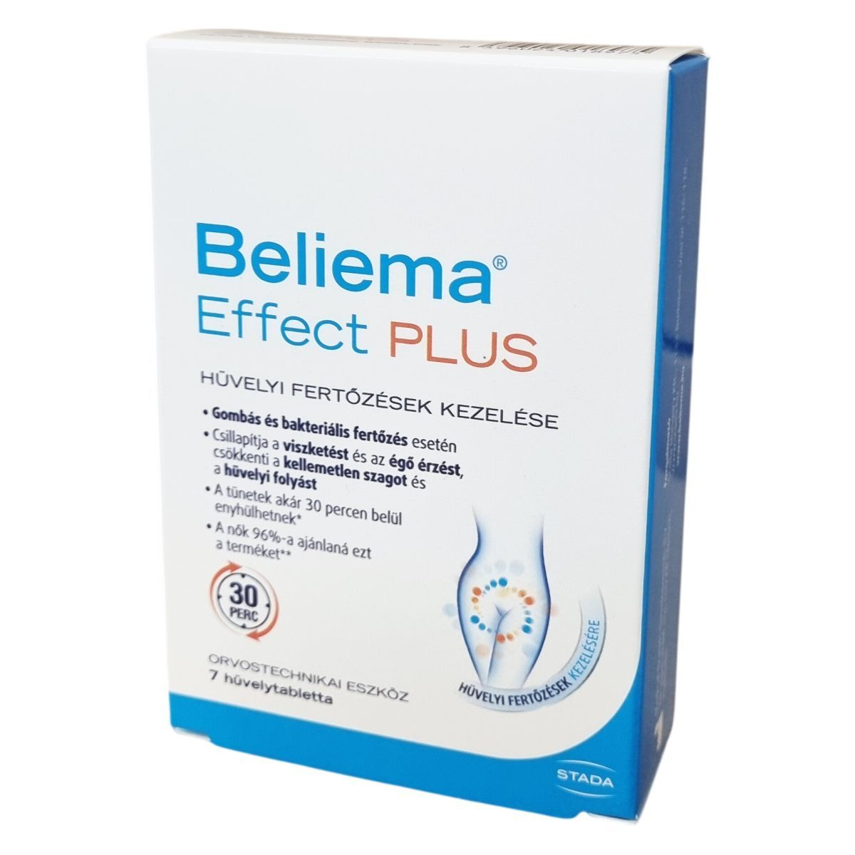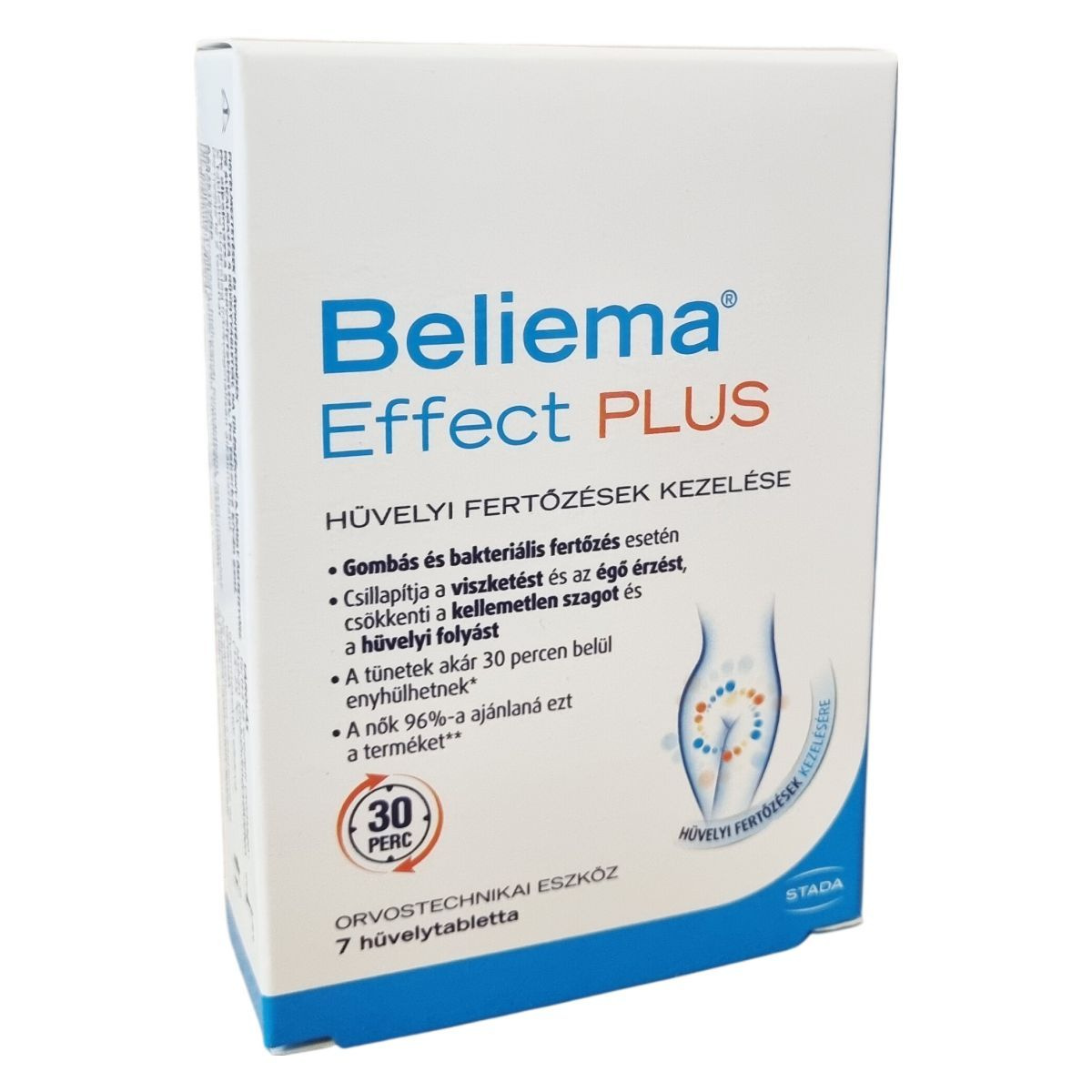 A Beliema® Effect PLUS egy orvostechnikai eszköz, amely 7 hüvelytablettát tartalmaz. Ez a termék kifejezetten a gombás vagy bakteriális hüvelyi fertőzések kezelésére készült, és a tünetek enyhítésében nyújthat segítséget, beleértve a viszketés és égő érzés csillapítását, a kellemetlen szag és hüvelyi folyás csökkentését vagy megszüntetését. A készítmény már 30 perc alatt enyhítheti a tüneteket, és a klinikai vizsgálatok szerint a nők jelentős része 4-5 napos kezelést követően tapasztalhatja a tünetek megszűnését. A kezelés során a hüvelytabletta támogatja a hüvelyi pH értékének fenntartását és a hüvelyflóra természetes egyensúlyának helyreállítását. A készítmény biztonságos és könnyen alkalmazható, nem hagy foltot. Alkalmazása 16 éven felüli nők számára javasolt, azonban terhesség vagy szoptatás időszakában a biztonságosság nem ismert, ezért ilyen esetben orvosi konzultáció ajánlott. A csomagolás használati útmutatót is tartalmaz a helyes alkalmazás érdekében.