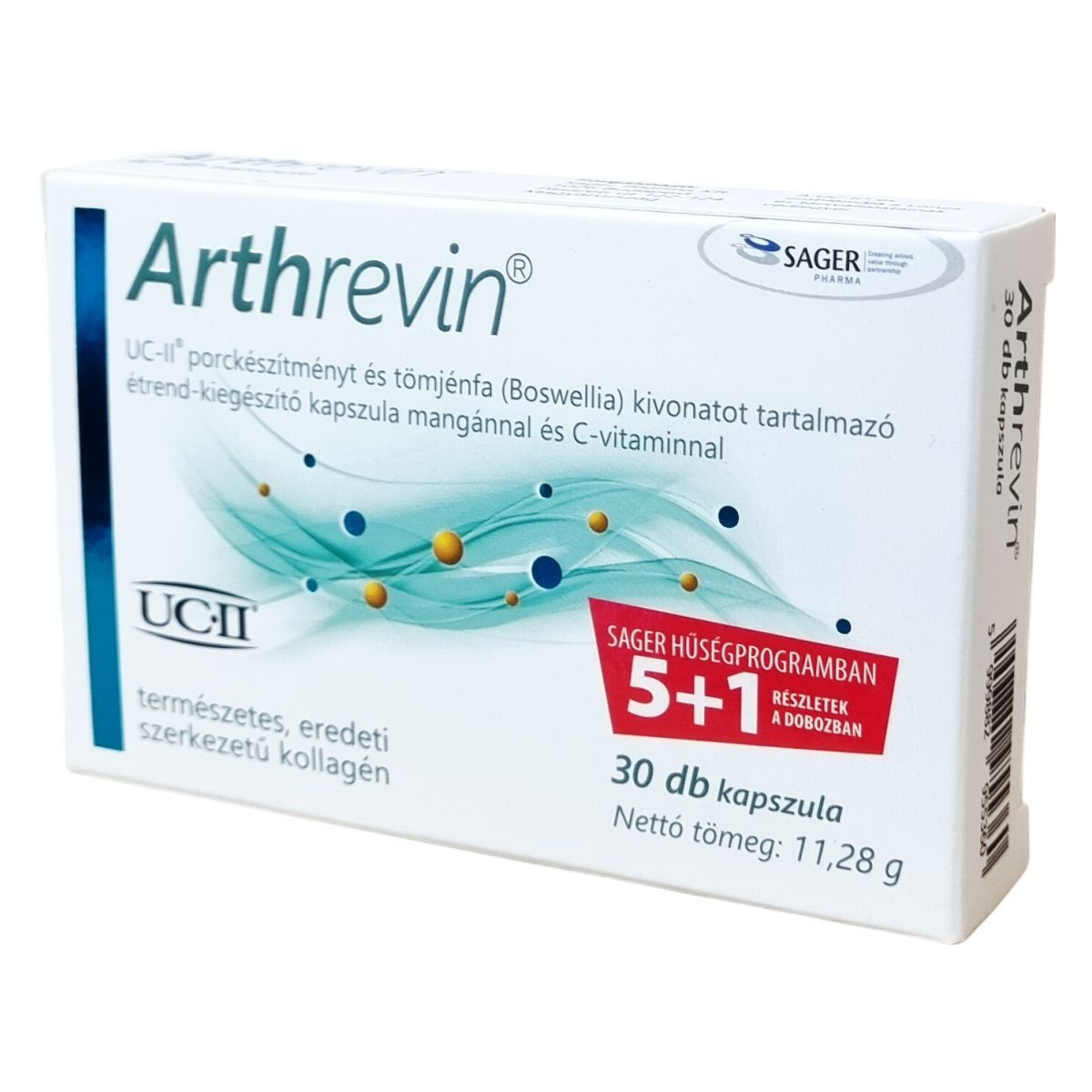 Az Arthrevin® kapszula II. típusú kollagént tartalmazó UC-II® porckészítményt, indiai tömjénfa (Boswellia serrata) gyanta kivonatot, mangánt és C-vitamint foglal magában. Az UC-II® egy szabadalmazott, nem denaturált, az eredeti szerkezetét megtartott, természetes eredetű II. típusú kollagén porított formában, amely étrend-kiegészítési célokra készült. A tömjénfa kivonat hozzájárulhat az ízületek normál állapotának fenntartásához. A C-vitamin szerepet játszhat a normál kollagénképződésben és ezáltal a porcok normál állapotának és működésének fenntartásában. A mangán hozzájárulhat a normál kötőszövet-képződéshez. A termék a SAGER HŰSÉGPROGRAM része és 30 darab kapszulát tartalmaz egy dobozban. A UC-II® és emblémája a Lonza és társvállalatainak védjegyei.